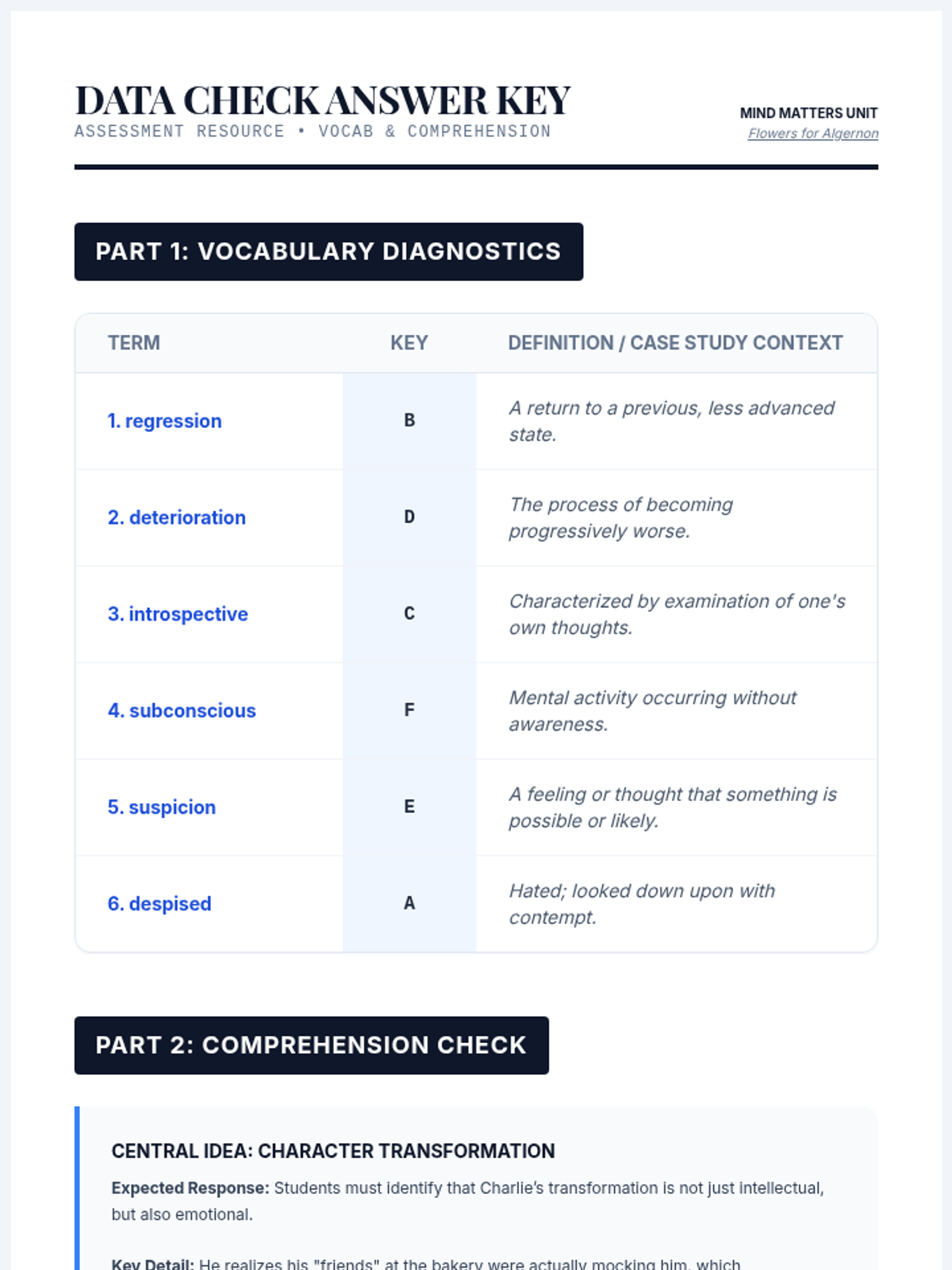 A comprehensive answer key for the vocabulary diagnostics and comprehension sections of the "Mind Matters" unit, featuring matching keys for all 6 core terms and success criteria for summary tasks.