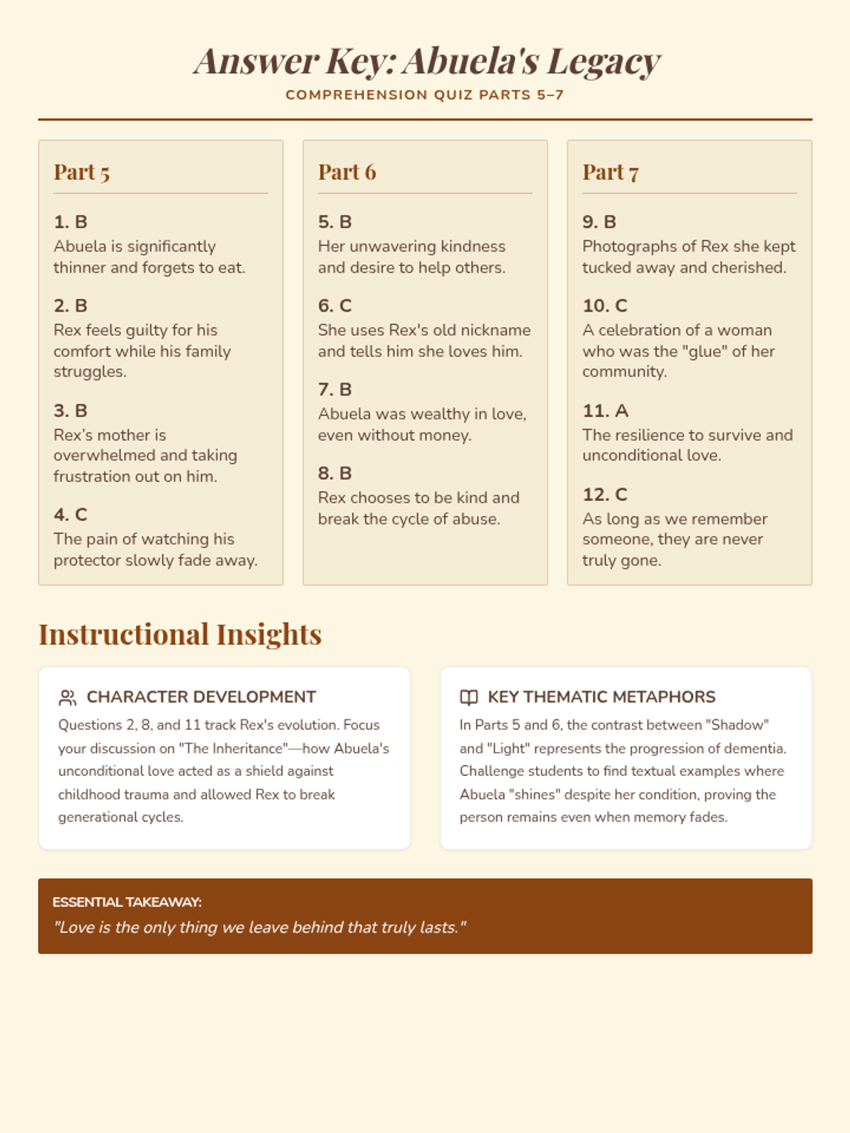 Revised Answer Key for 'Abuela's Legacy' with optimized single-page layout, improved readability, and clear instructional notes.