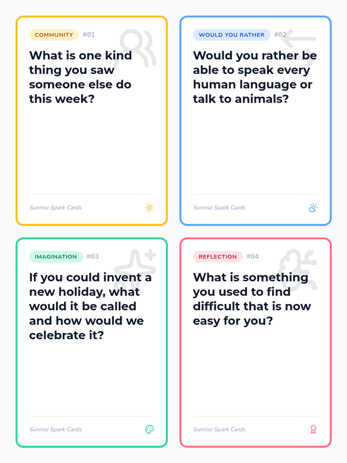 A set of 16 vibrant, themed morning meeting task cards covering community building, reflection, imagination, and "would you rather" questions.
