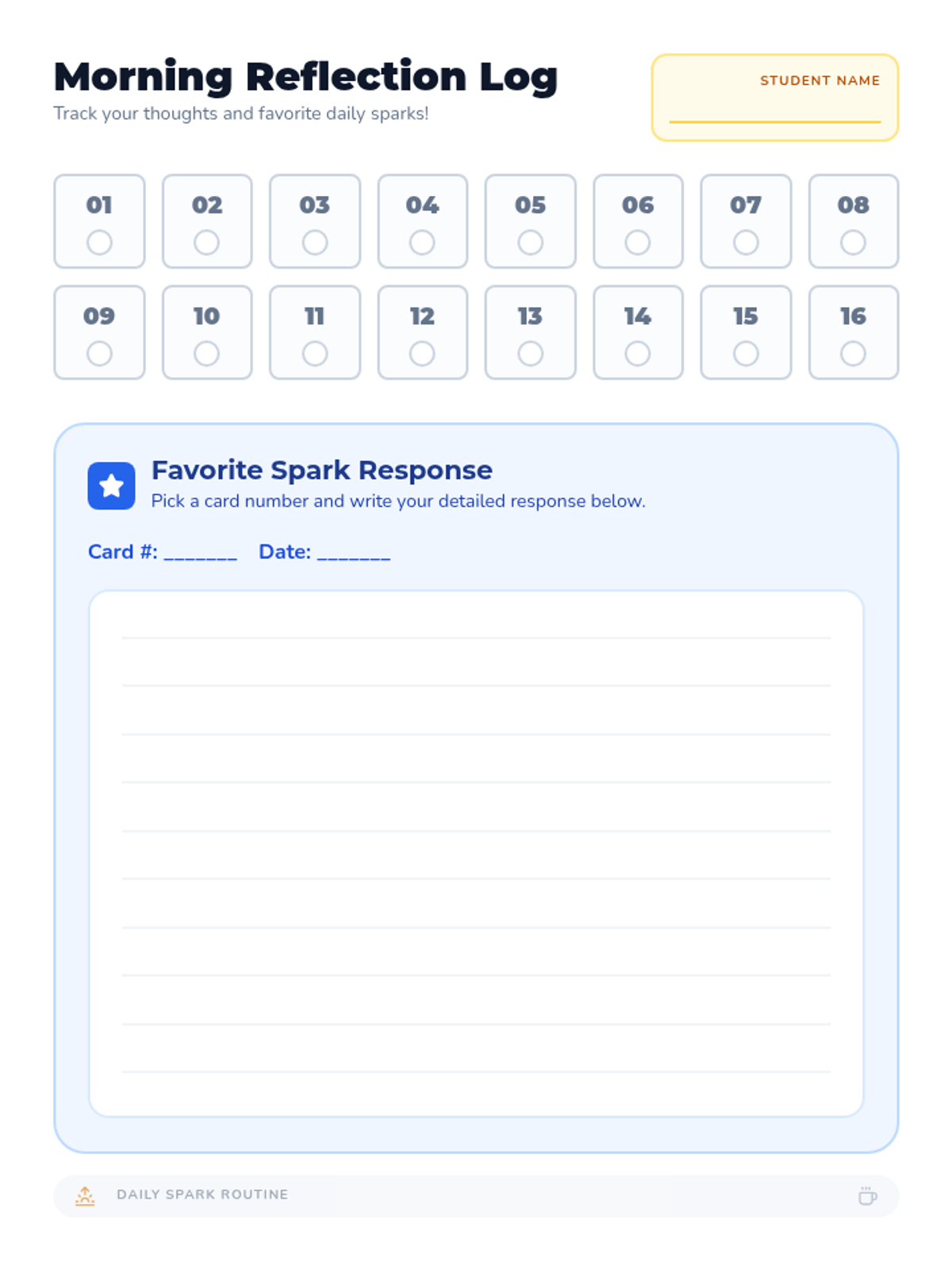 A student-facing log for tracking completed morning meeting questions and recording a detailed reflection on a favorite prompt.