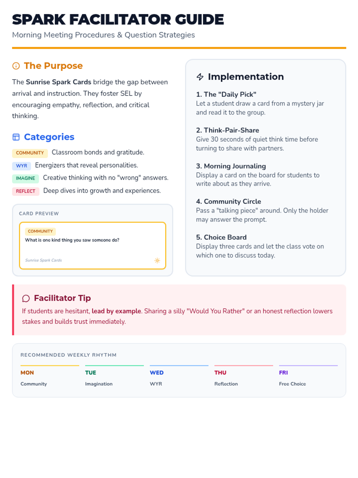 A facilitator's guide providing instructions, category breakdowns, and implementation strategies for using morning meeting prompt cards.
