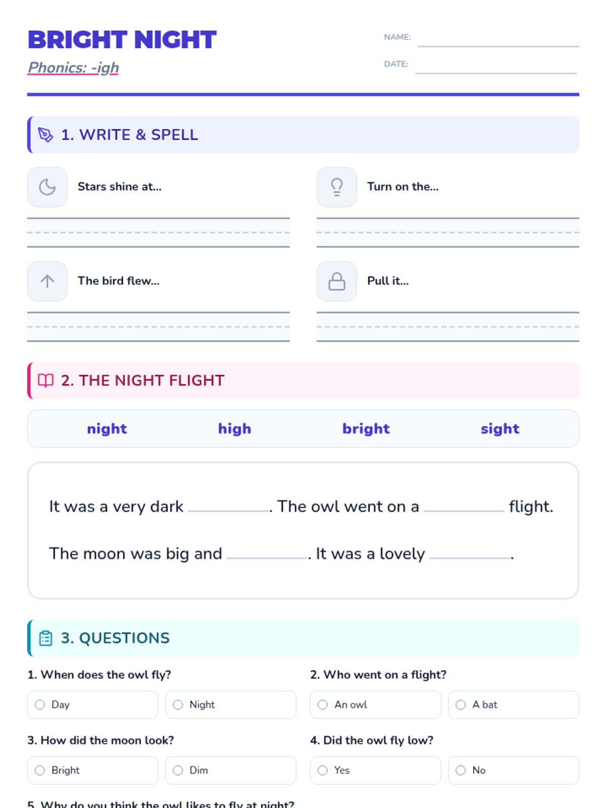 A comprehensive student worksheet for the -igh phonics sound, now consolidated to fit a single page. Features primary writing lines (tri-lines) for spelling and short answers to support handwriting development.