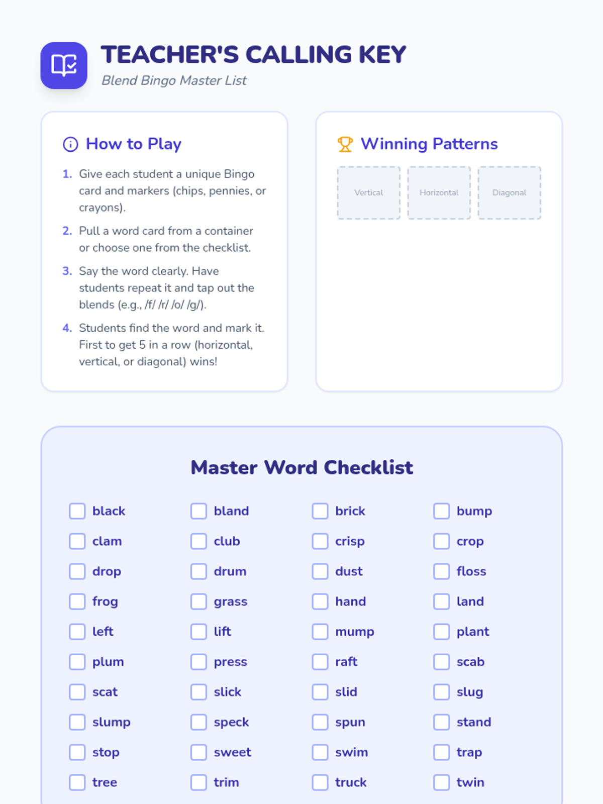 A teacher's calling key and cut-out cards for the Blend Bingo game. Includes a master word checklist, game instructions, and 40 individual word cards for randomized calling.