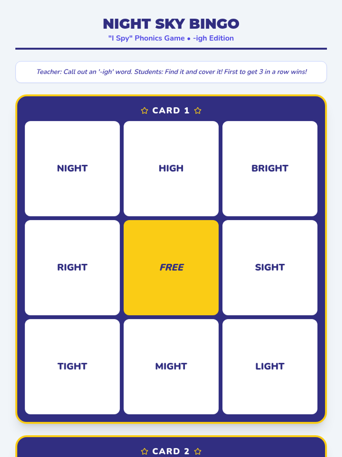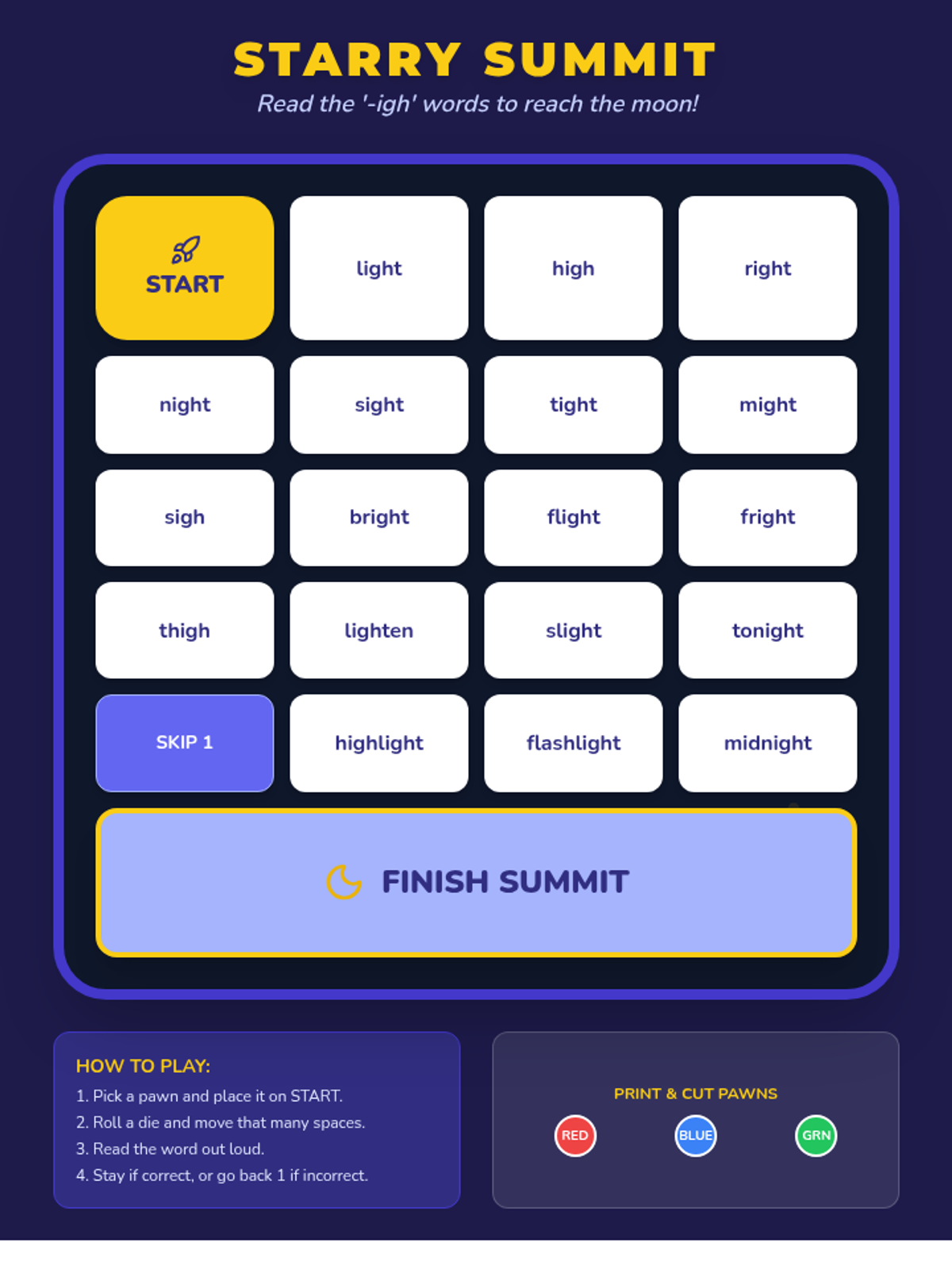 A printable board game for up to 3 players where they move across a starry night path by reading '-igh' words, optimized for printable width.