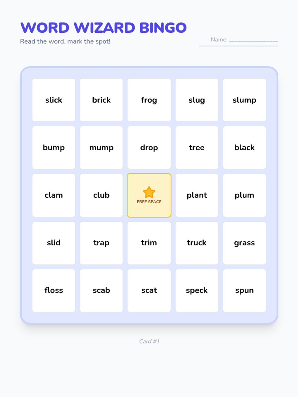 A teacher's master word list and 40 cut-out calling cards for Blend Bingo, updated with the Nunito font and centered on each page for a clean, organized look.