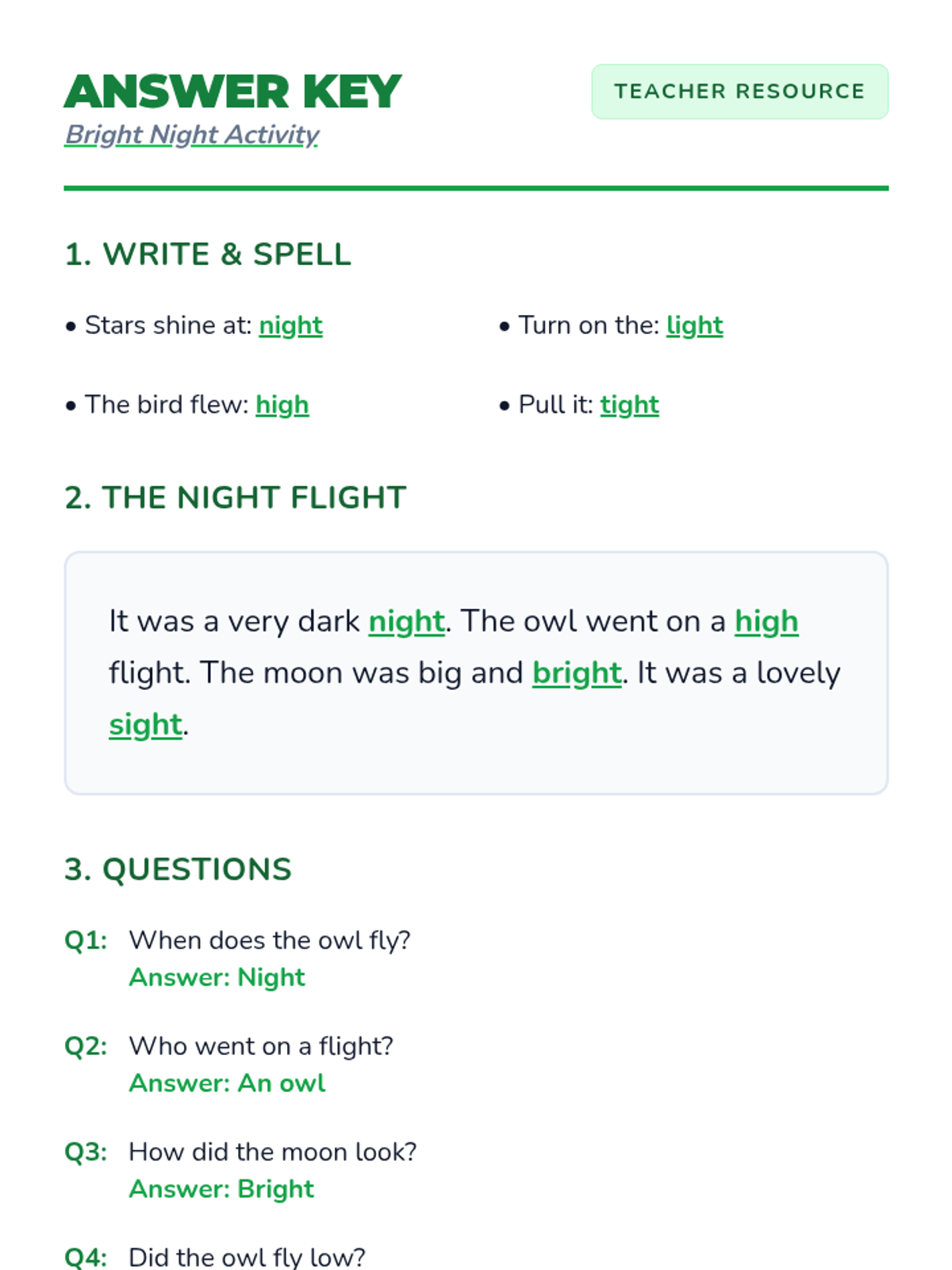 A clear and concise answer key for the Bright Night Worksheet, designed for teacher use.