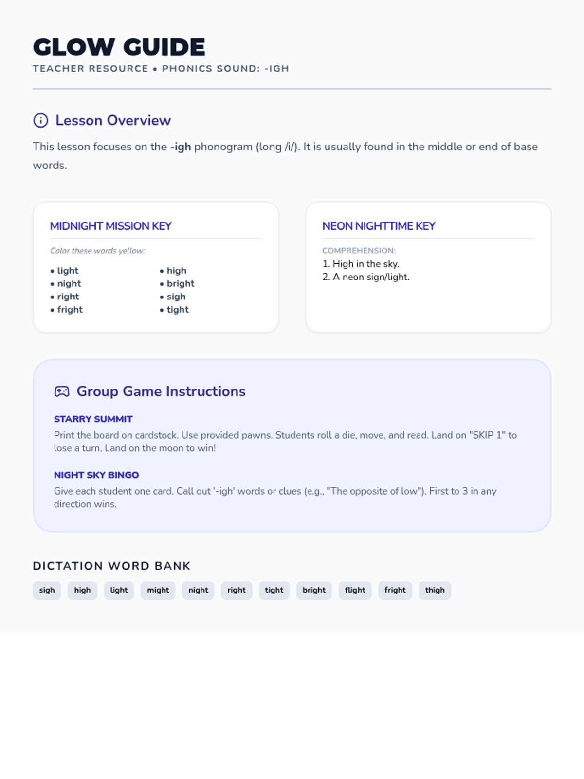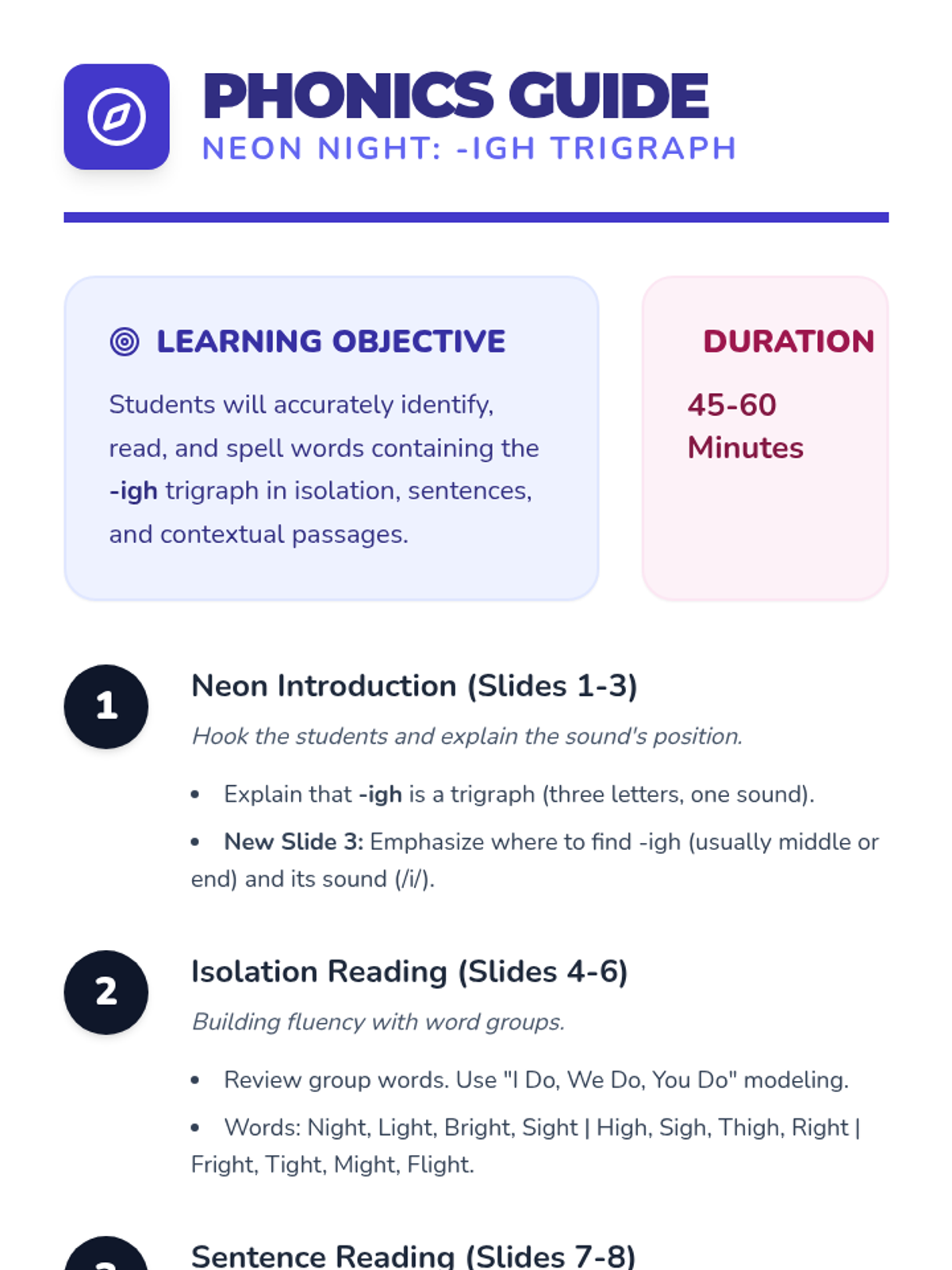 A professional and structured teacher guide for the Neon Night Phonics lesson, outlining instructional steps, learning objectives, and teaching tips.
