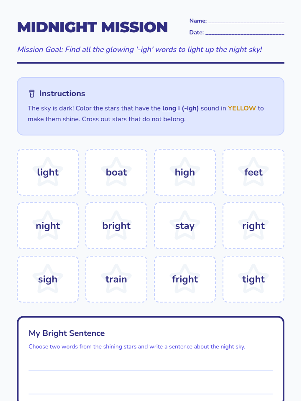A word identification worksheet where students find and color stars containing '-igh' words to 'light up the night sky', optimized for printing.