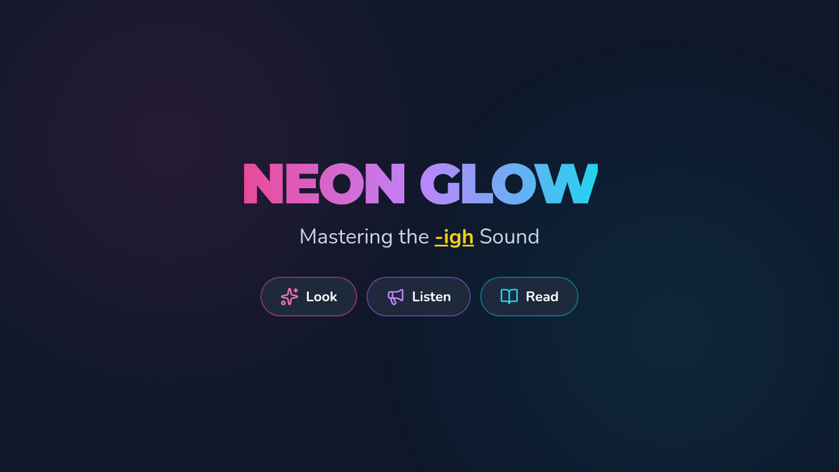 An engaging slide presentation for teaching the -igh phonics sound, featuring vibrant neon aesthetics, word isolation practice, and contextualized sentence reading. Includes a new slide on sound identification and placement.