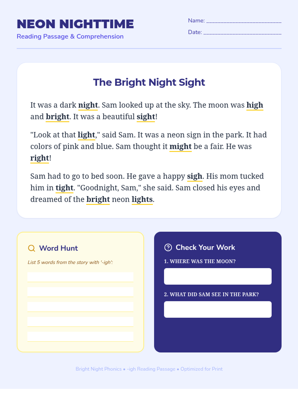 A 1st-2nd grade level reading passage about neon lights and nighttime, featuring '-igh' words and comprehension questions, optimized for print.
