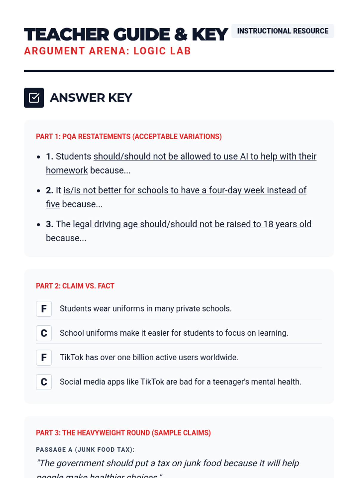 Teacher guide and answer key for the Argument Arena lesson. Includes sample responses, common pitfalls, and instructional strategies for supporting Hi-Lo learners. Revised for better layout and page flow.