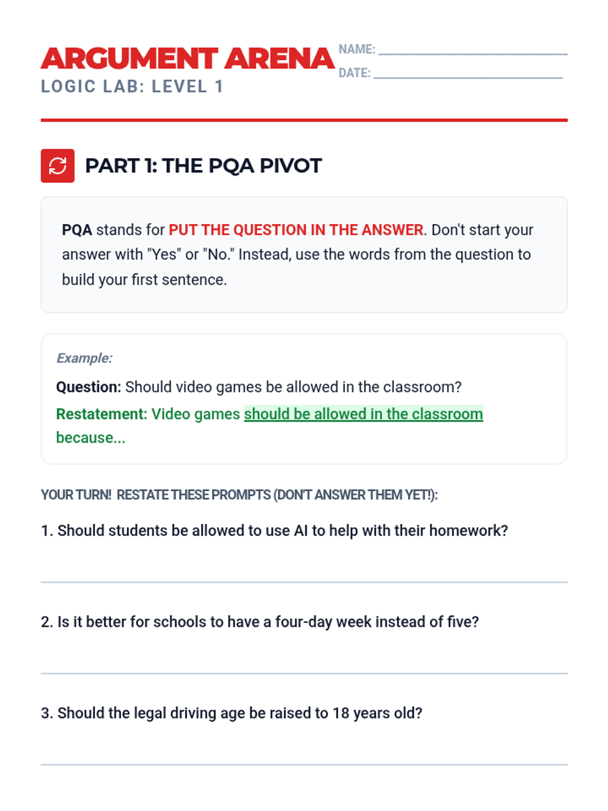 A scaffolded ELA worksheet focusing on restating prompts (PQA) and writing debatable claims. Features high-interest, low-readability passages suitable for 7th grade students. Revised for better page breaks and spacing.