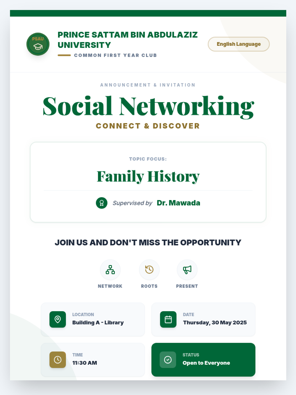 A professional invitation poster for a presentation at Prince Sattam bin Abdulaziz University (PSAU). It features the university colors (green and gold), club details, and specific event information for a session on Social Networking and Family History.