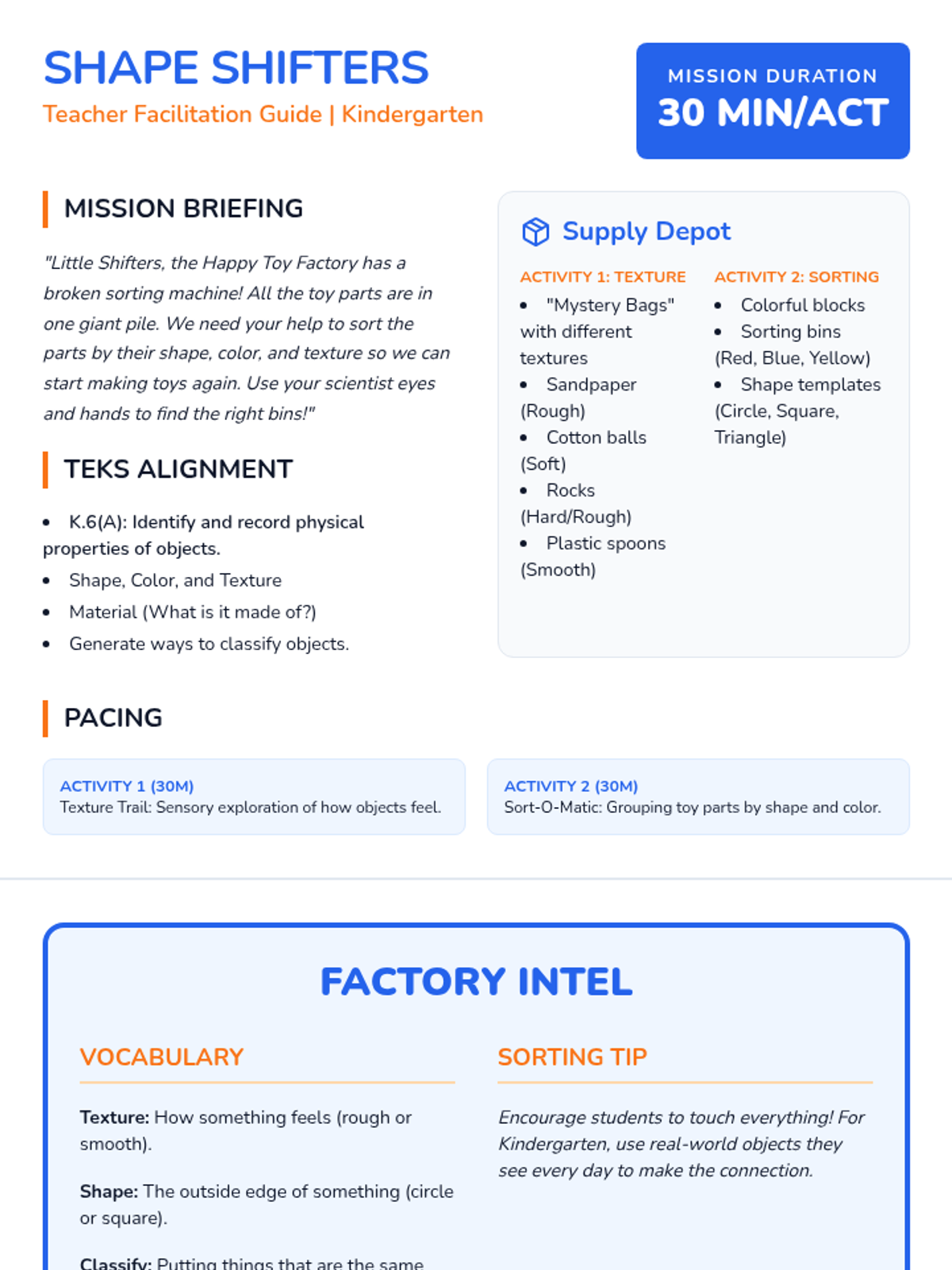 A teacher facilitation guide for Kindergarten Shape Shifters. Covers classifying by shape, color, texture, and material with hands-on activities.