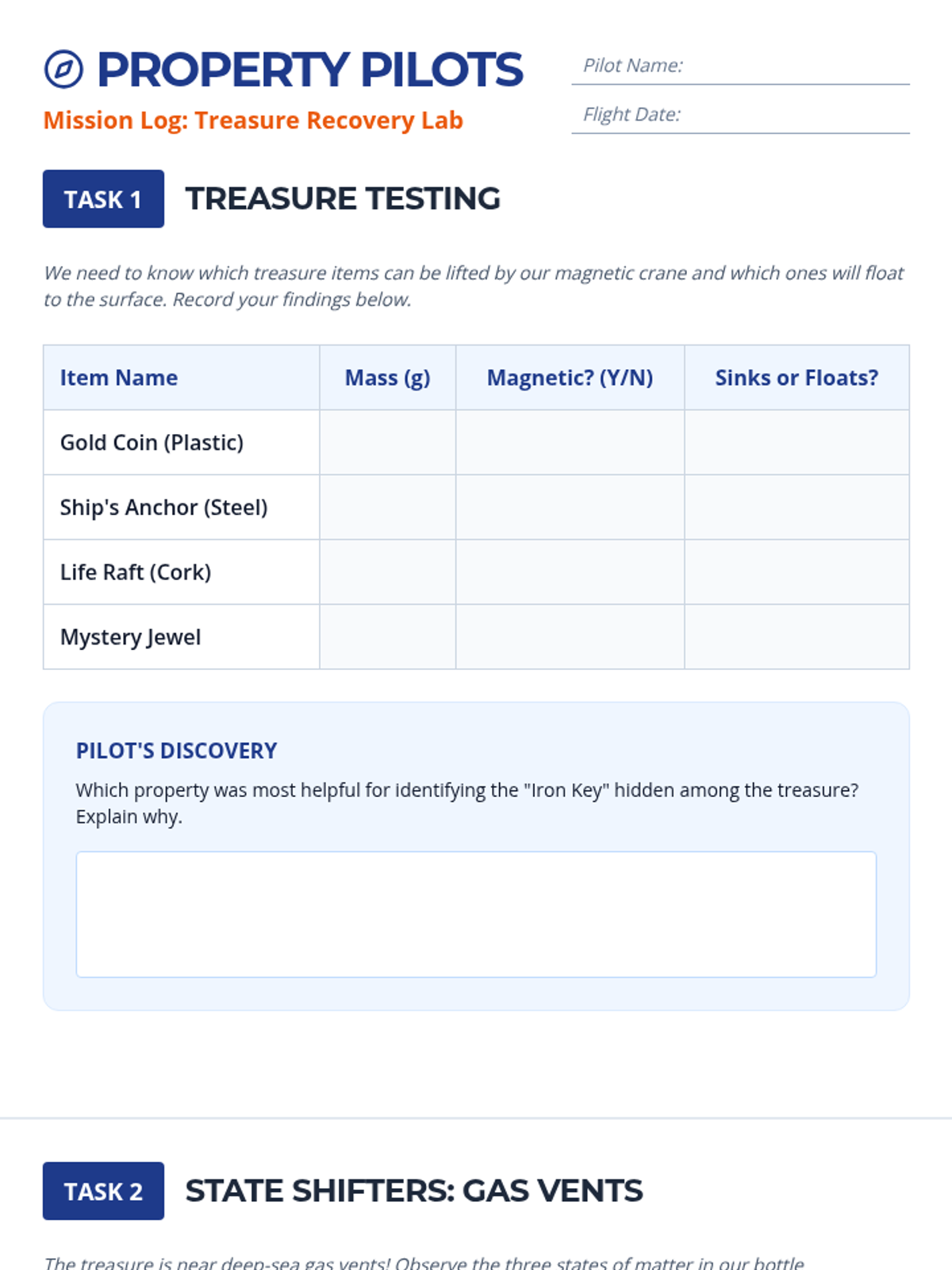 A 2-page student mission log for 3rd Grade Property Pilots. Features treasure-themed data tables for mass, magnetism, and buoyancy, plus a states of matter observation lab.