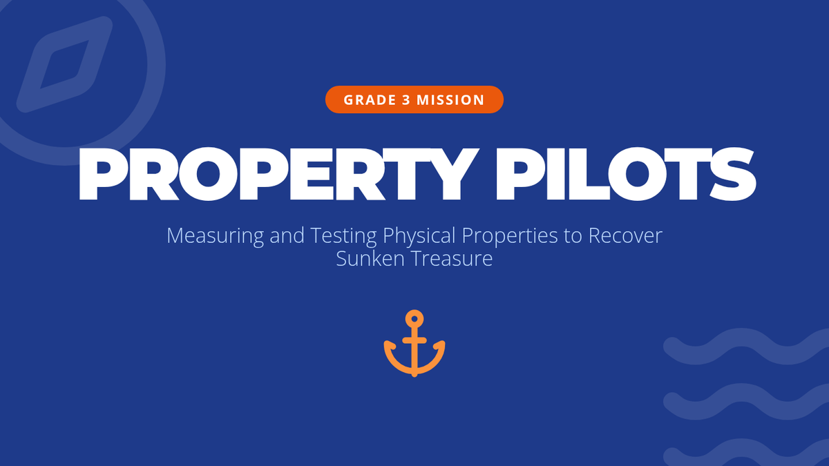 A 6-slide presentation for 3rd Grade Property Pilots. Features treasure-themed hooks, vocabulary (mass/buoyancy), activity instructions, and a mastery check.