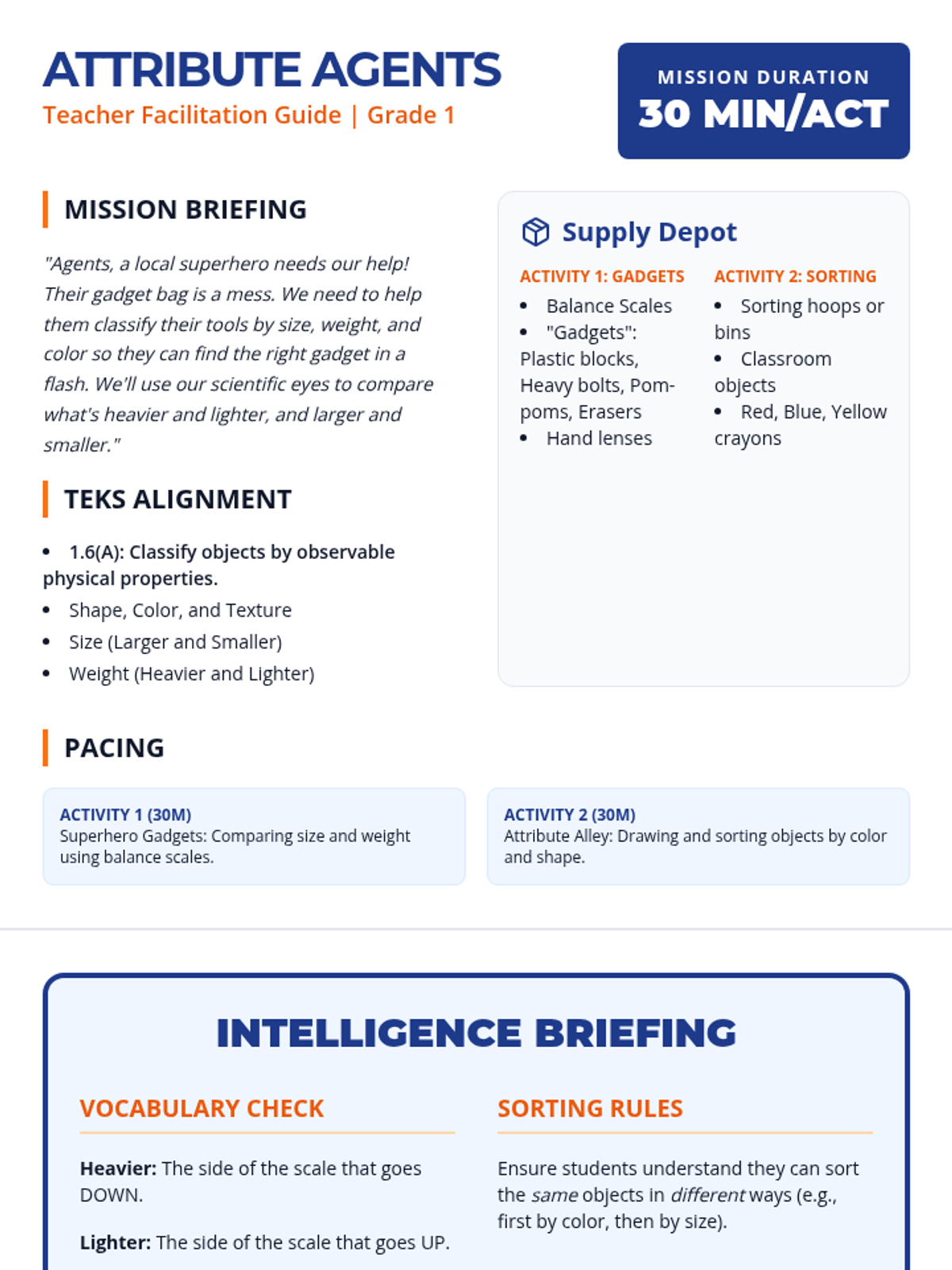 A teacher facilitation guide for 1st Grade Attribute Agents. Covers classifying by size, weight, and multiple observable attributes with activities and discussion points.