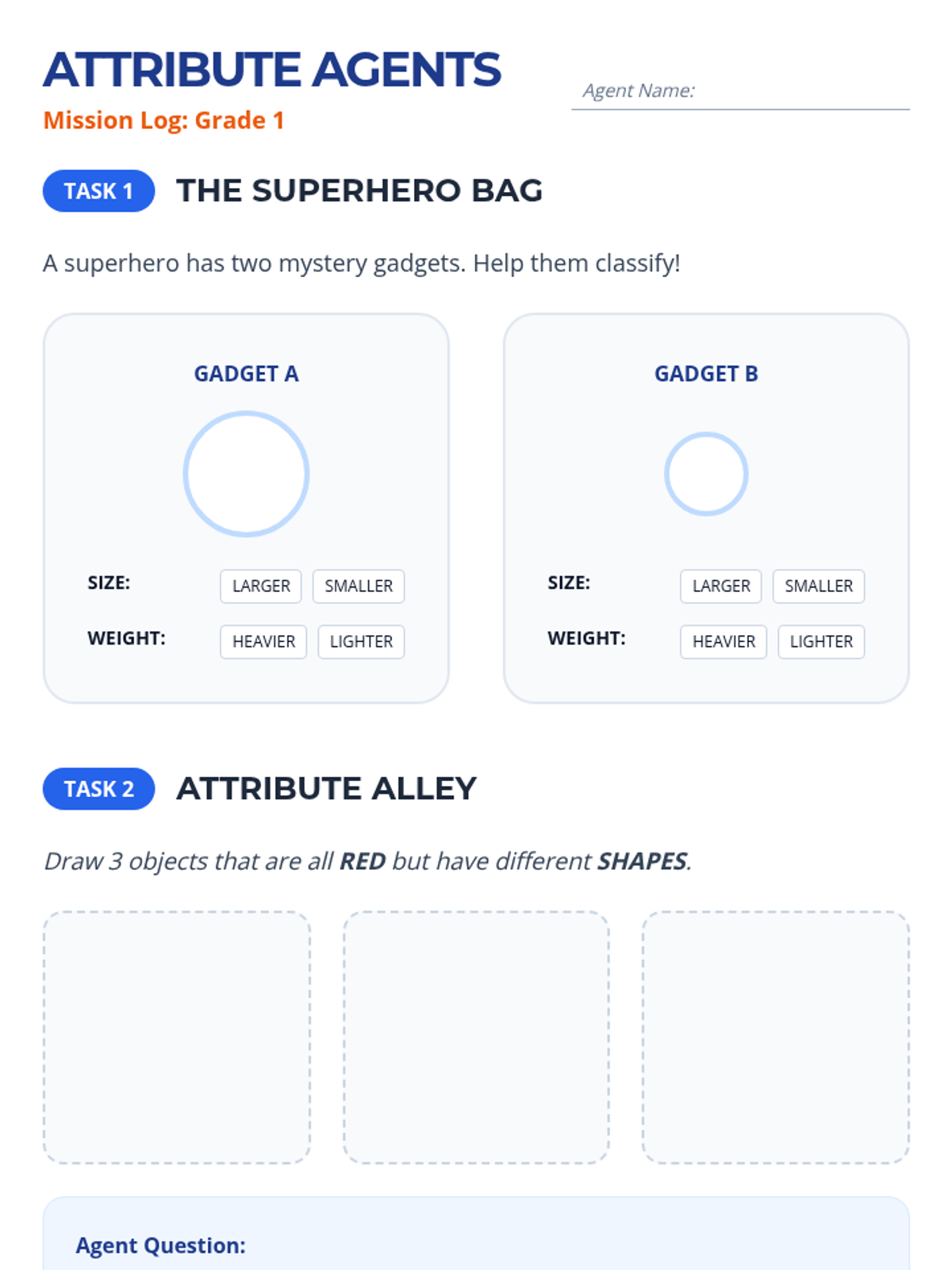 A 1-page student mission log for 1st Grade Attribute Agents. Focuses on classifying objects by size, weight, and multiple observable attributes.