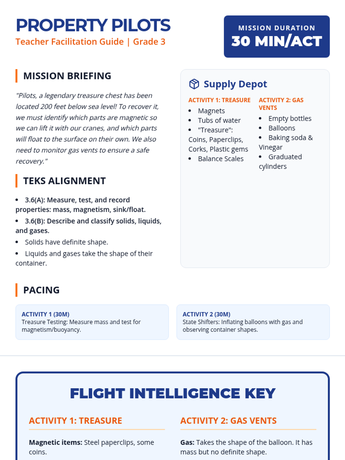 A teacher facilitation guide for 3rd Grade Property Pilots. Covers magnetism, buoyancy, and states of matter with supply lists and answer keys.