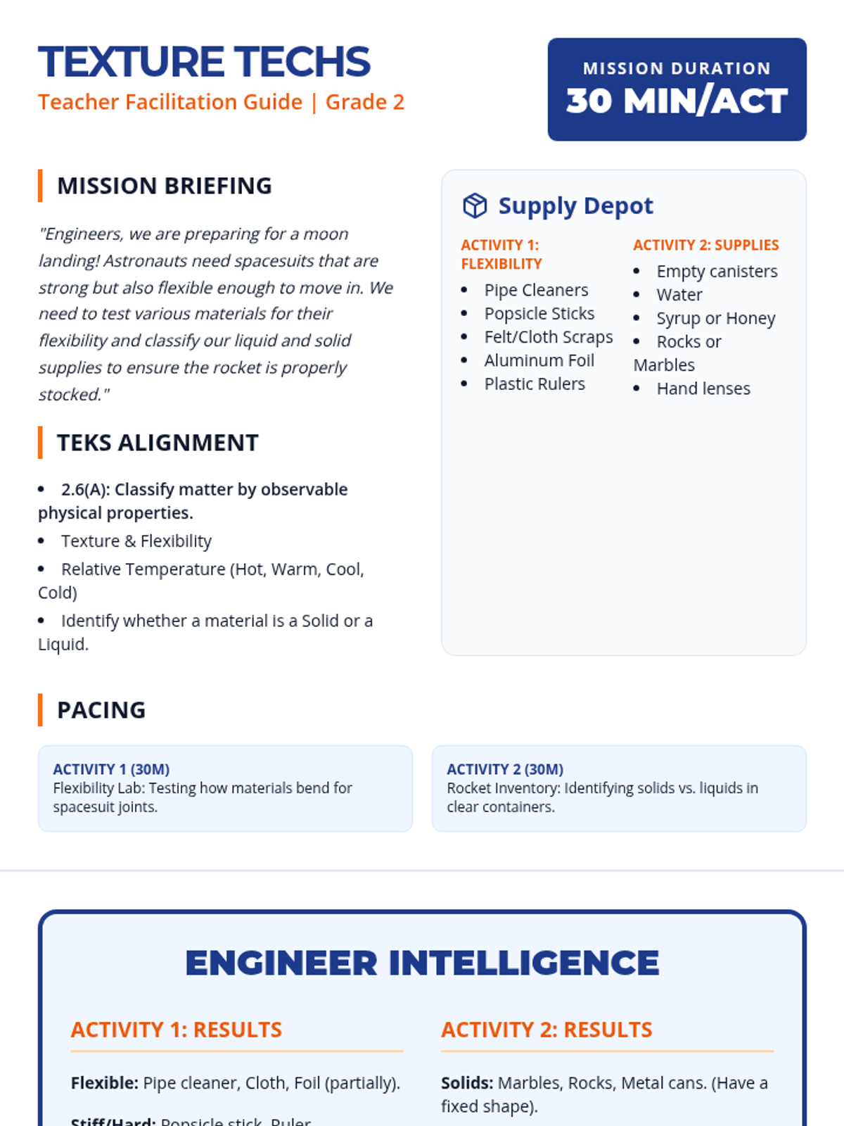 A teacher facilitation guide for 2nd Grade Texture Techs. Covers properties of flexibility and physical states (solid/liquid) with activities and assessment questions.