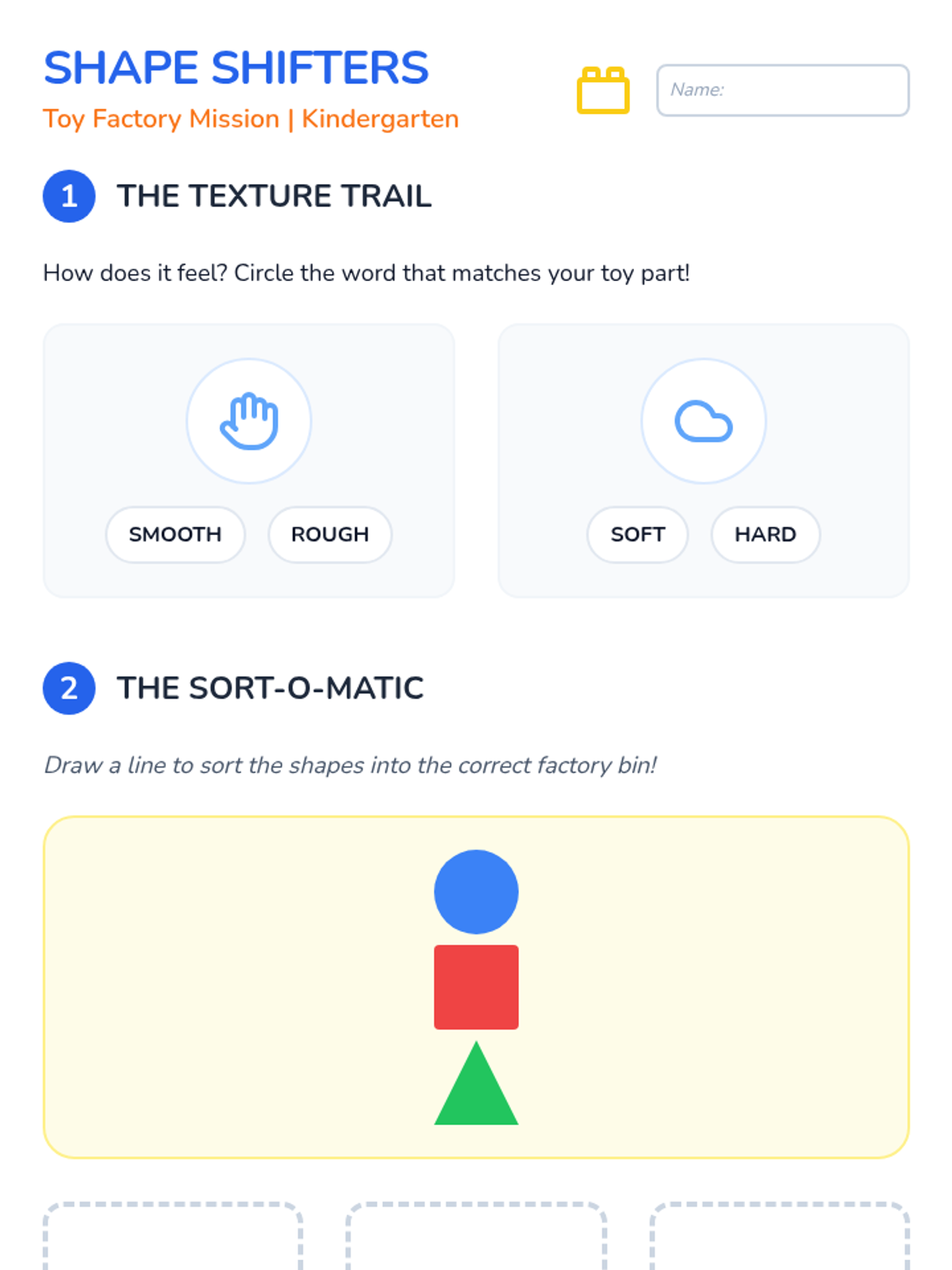 A visual 2-page student mission log for Kindergarten Shape Shifters. Features texture circling, shape sorting lines, and color coding for toy factory components.
