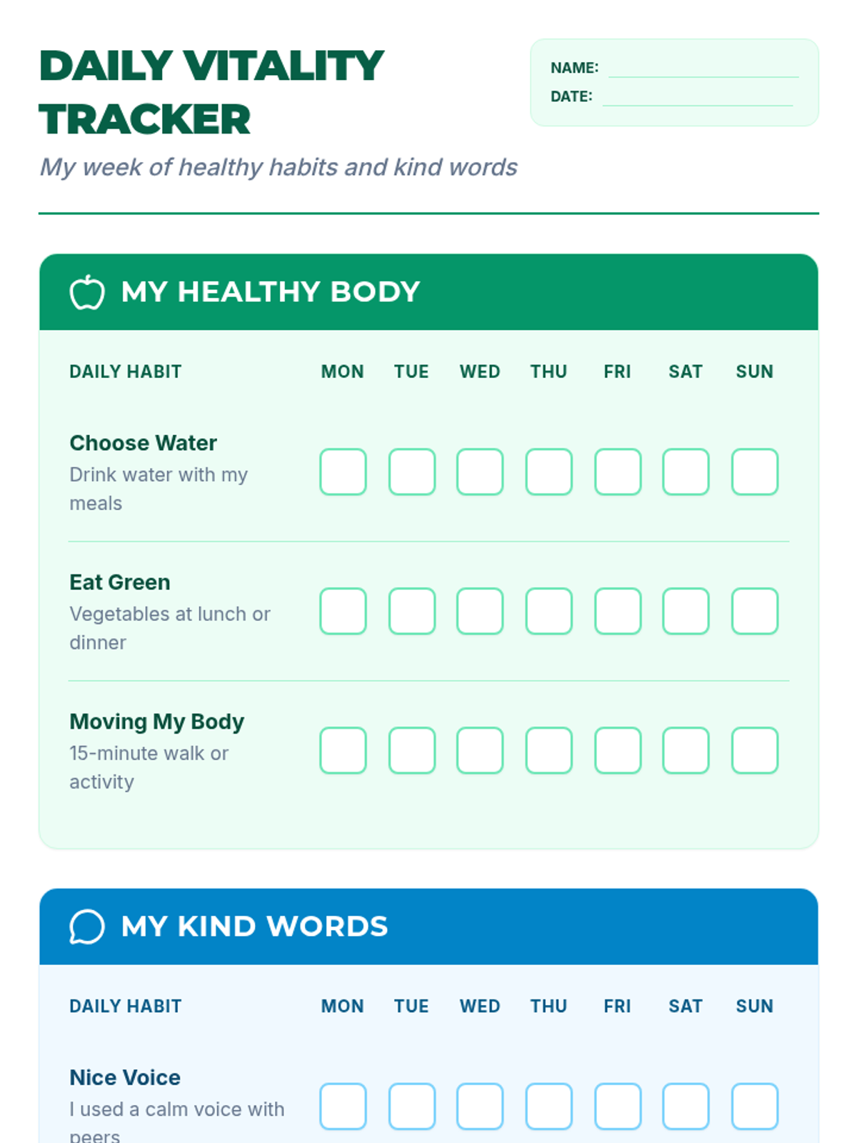 A 7-day visual habit tracker for adults with mild intellectual disabilities. It includes sections for healthy physical habits (water, vegetables, exercise) to support diabetes prevention, as well as social communication habits (calm voice, frustration management).