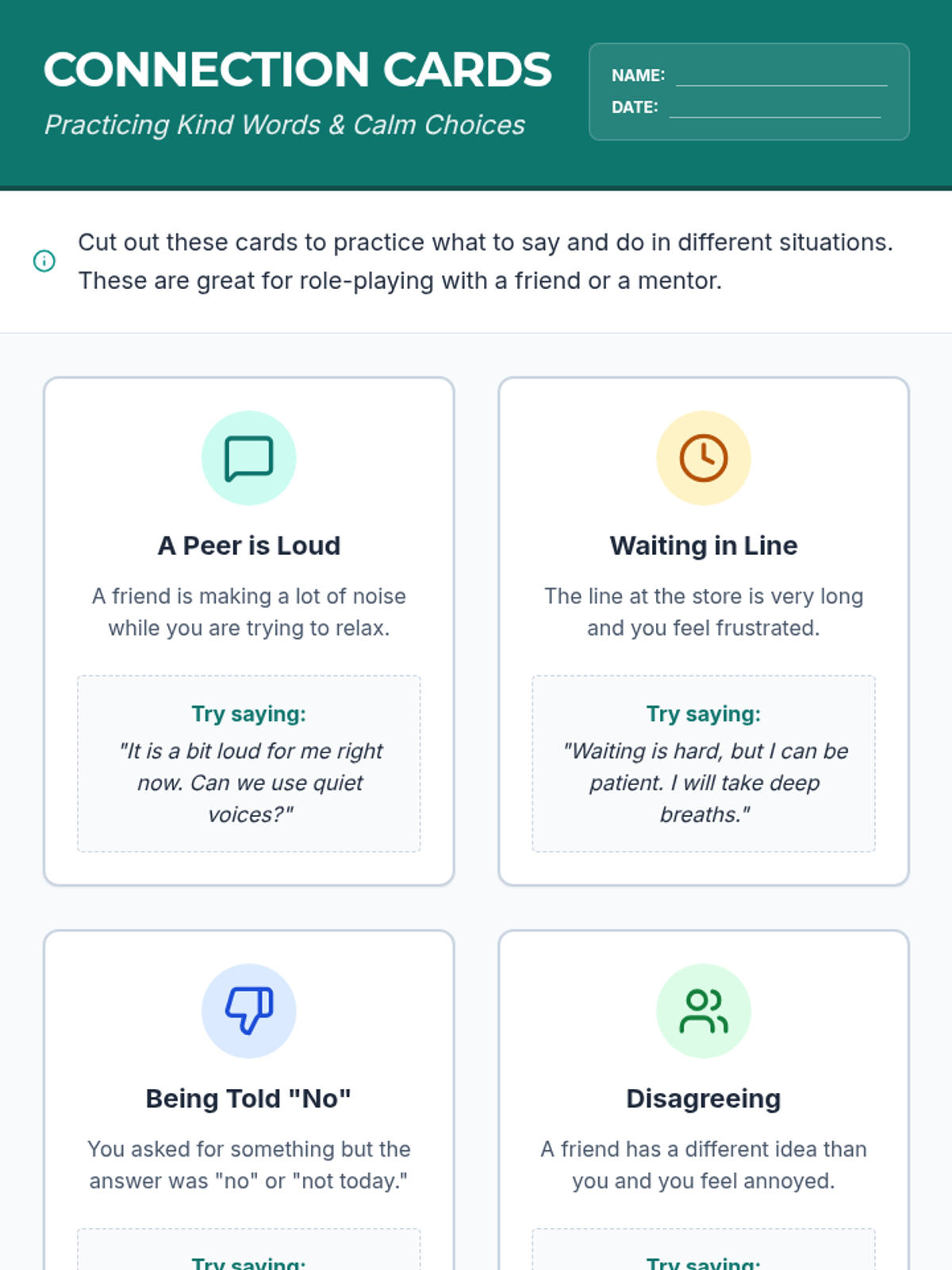 A set of 8 visual scenario cards designed for adults with mild intellectual disabilities. Each card presents a common social or health-related challenge and provides a clear, respectful script or action step to practice frustration tolerance and social communication.