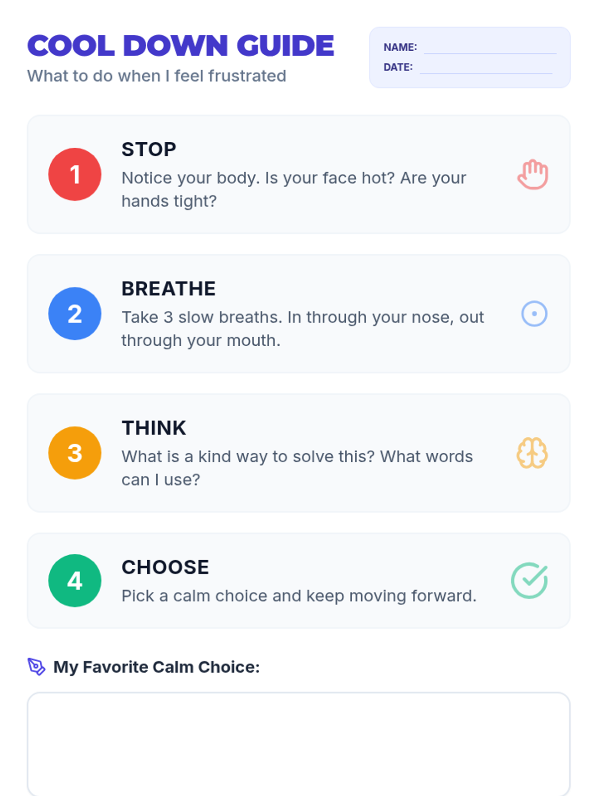 A highly visual, step-by-step 'Stop and Think' guide for adults with mild intellectual disabilities. It breaks down frustration tolerance into four actionable steps: Stop, Breathe, Think, and Choose, with ample space for personalization.