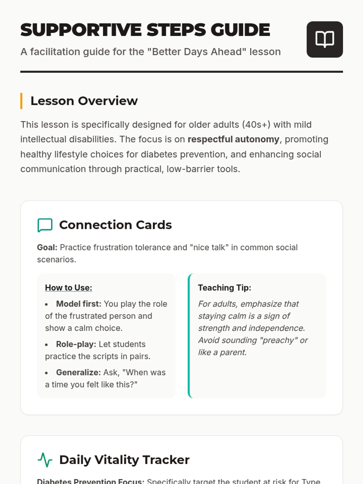 A facilitation guide for educators working with adults with mild intellectual disabilities. It provides specific instructions for implementing social skills training, habit tracking for diabetes prevention, and frustration management techniques.