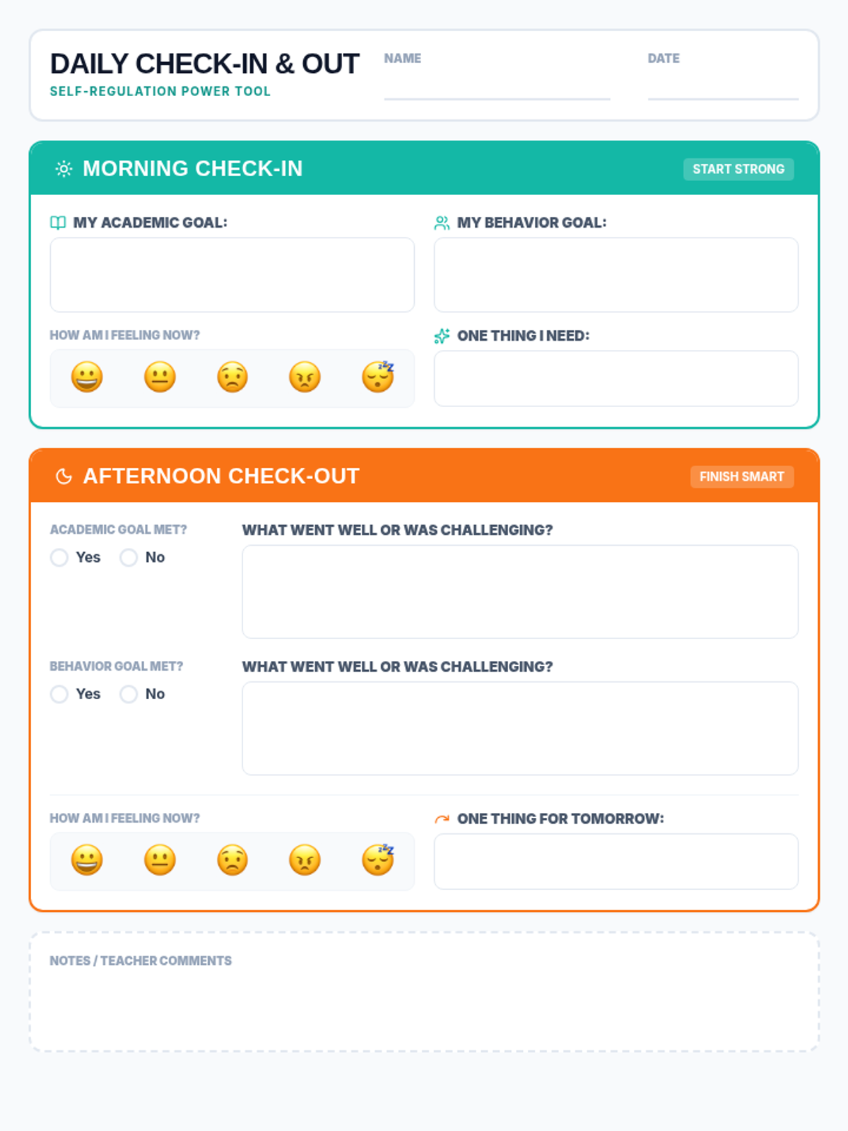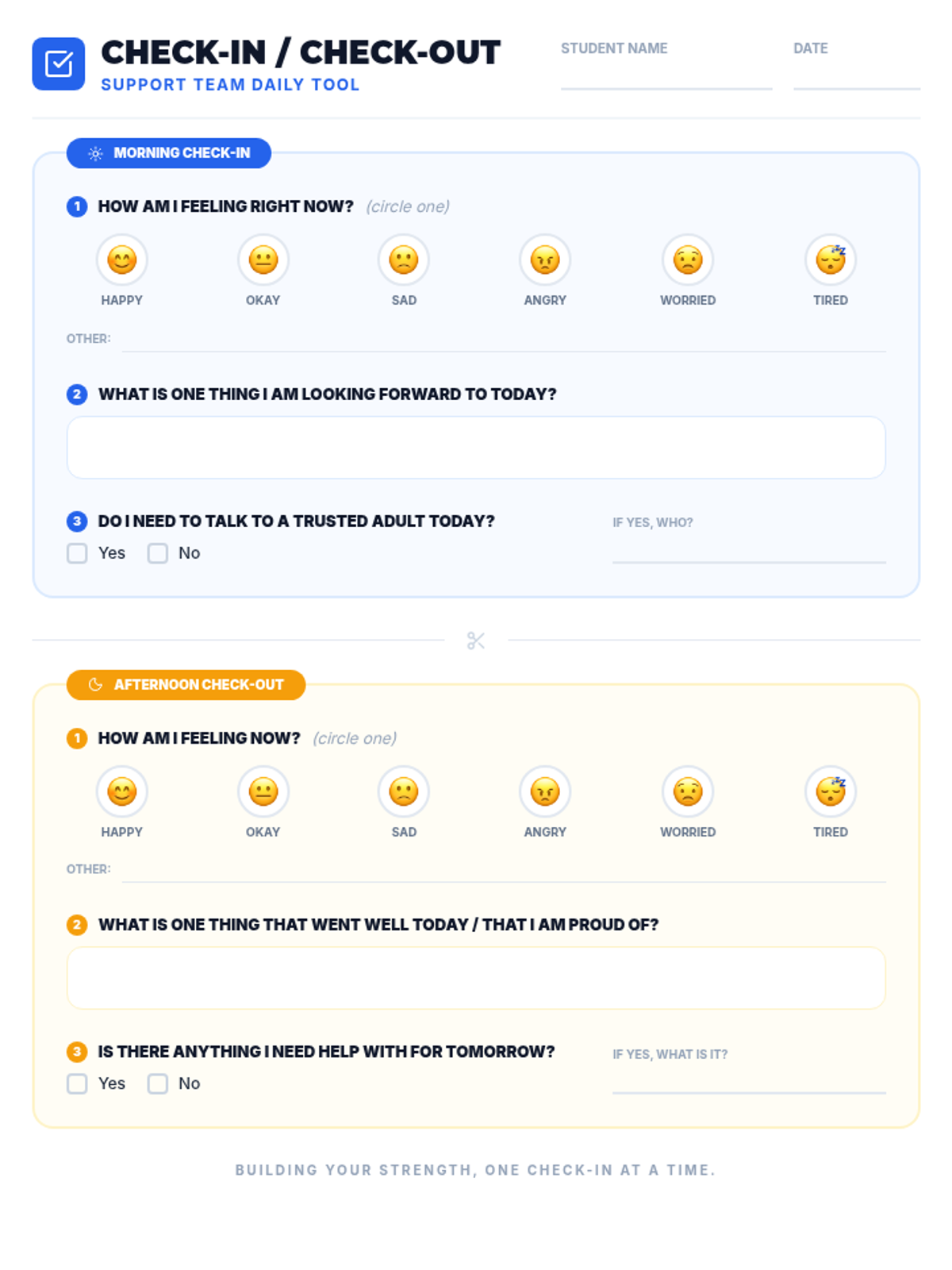 A refined one-page daily check-in and check-out form for students to track their emotions, set goals, and reflect on their day with support staff.