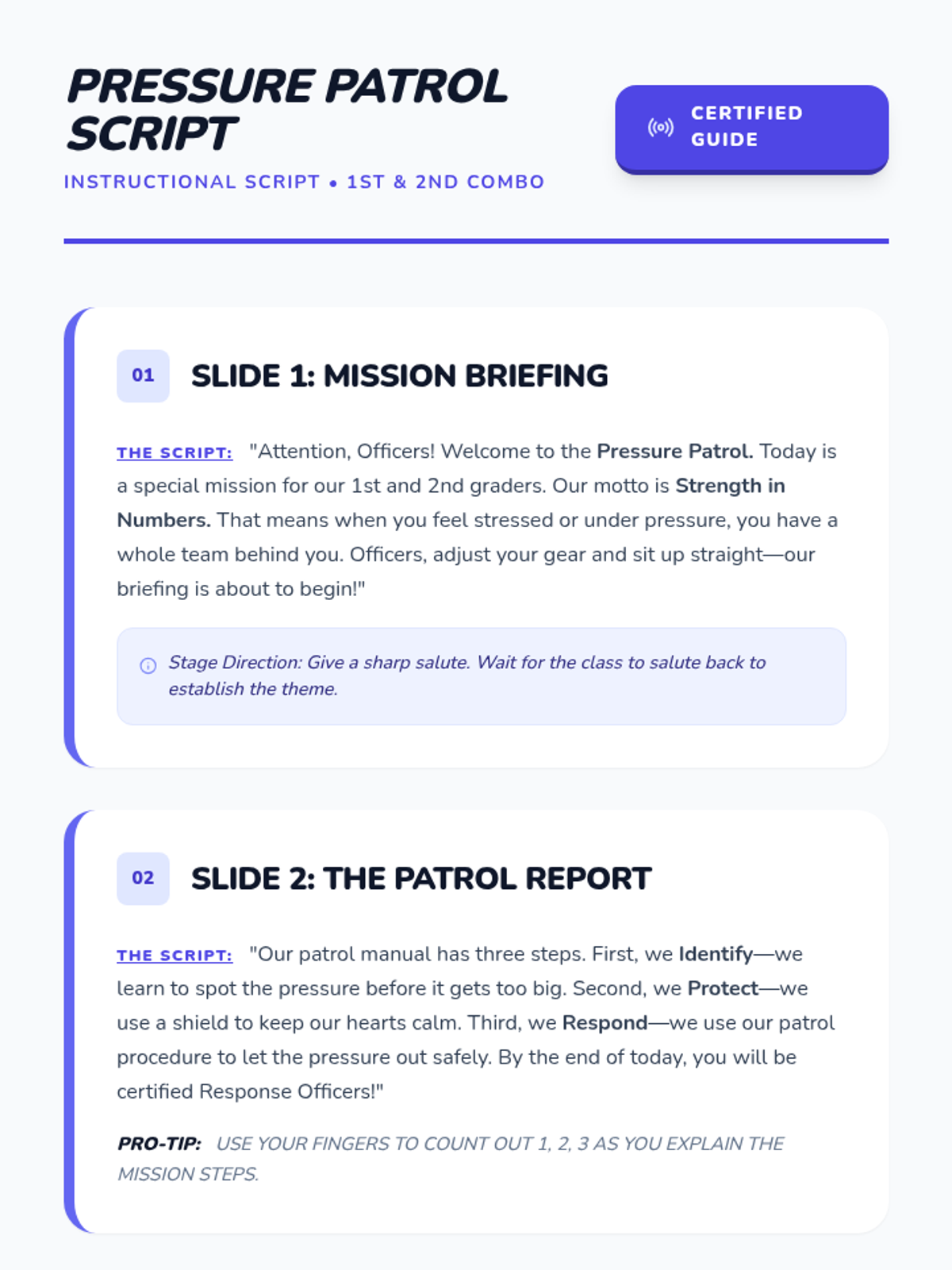 A detailed, slide-by-slide facilitation script for the 1st/2nd grade 'Pressure Patrol' combo lesson. Features an 'Officer Briefing' theme with word-for-word scripts, stage directions, and student engagement prompts. Terminology fixed to remove Markdown artifacts and improved spacing.