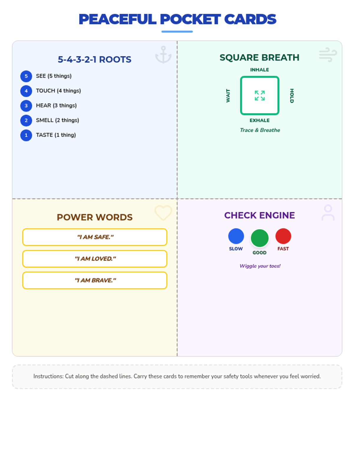 Printable calm-down kit cards featuring grounding techniques, breathing exercises, positive affirmations, and emotional self-regulation tools for 1st grade students.