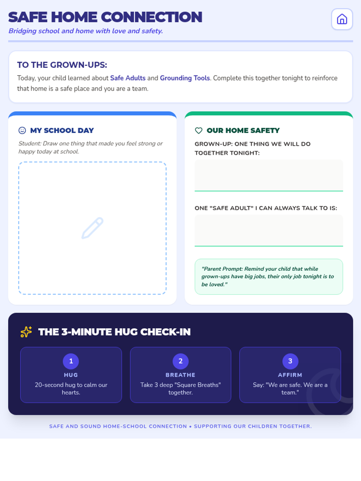 A collaborative home-school communication sheet and evening ritual guide to reinforce safety and connection between parent and child.