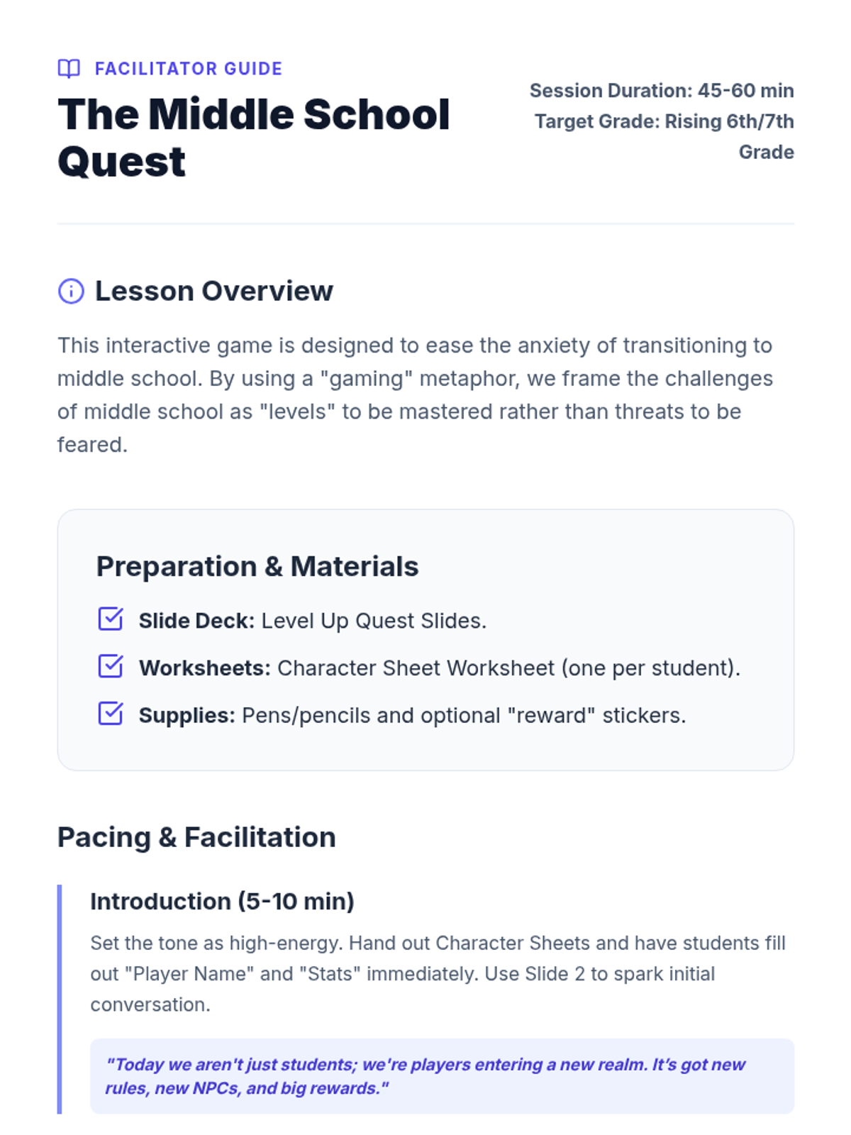 A teacher facilitation guide for the 'Middle School Quest' lesson. It provides pacing suggestions, discussion prompts for each game level, and tips for managing student anxiety during the transition.