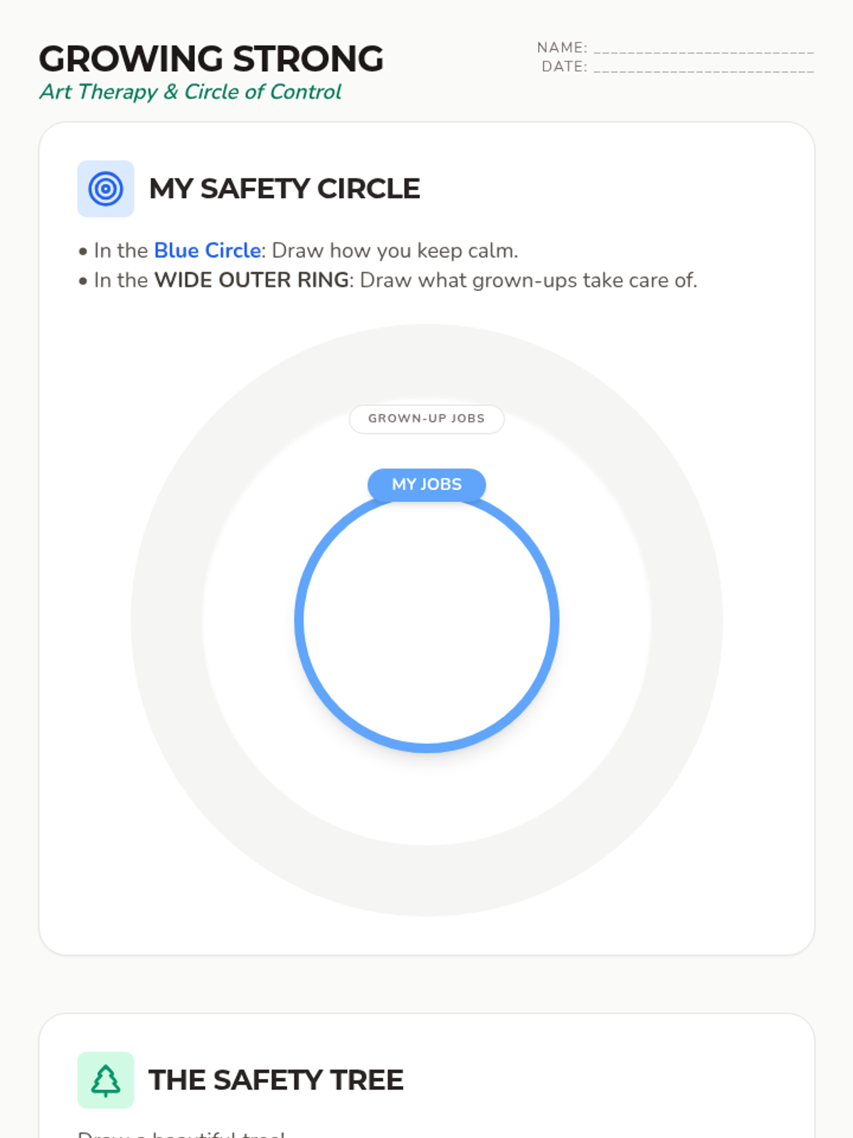 An art therapy activity for 1st graders focusing on the 'Circle of Control' and identifying safe adults at home and school to provide a sense of agency and security.