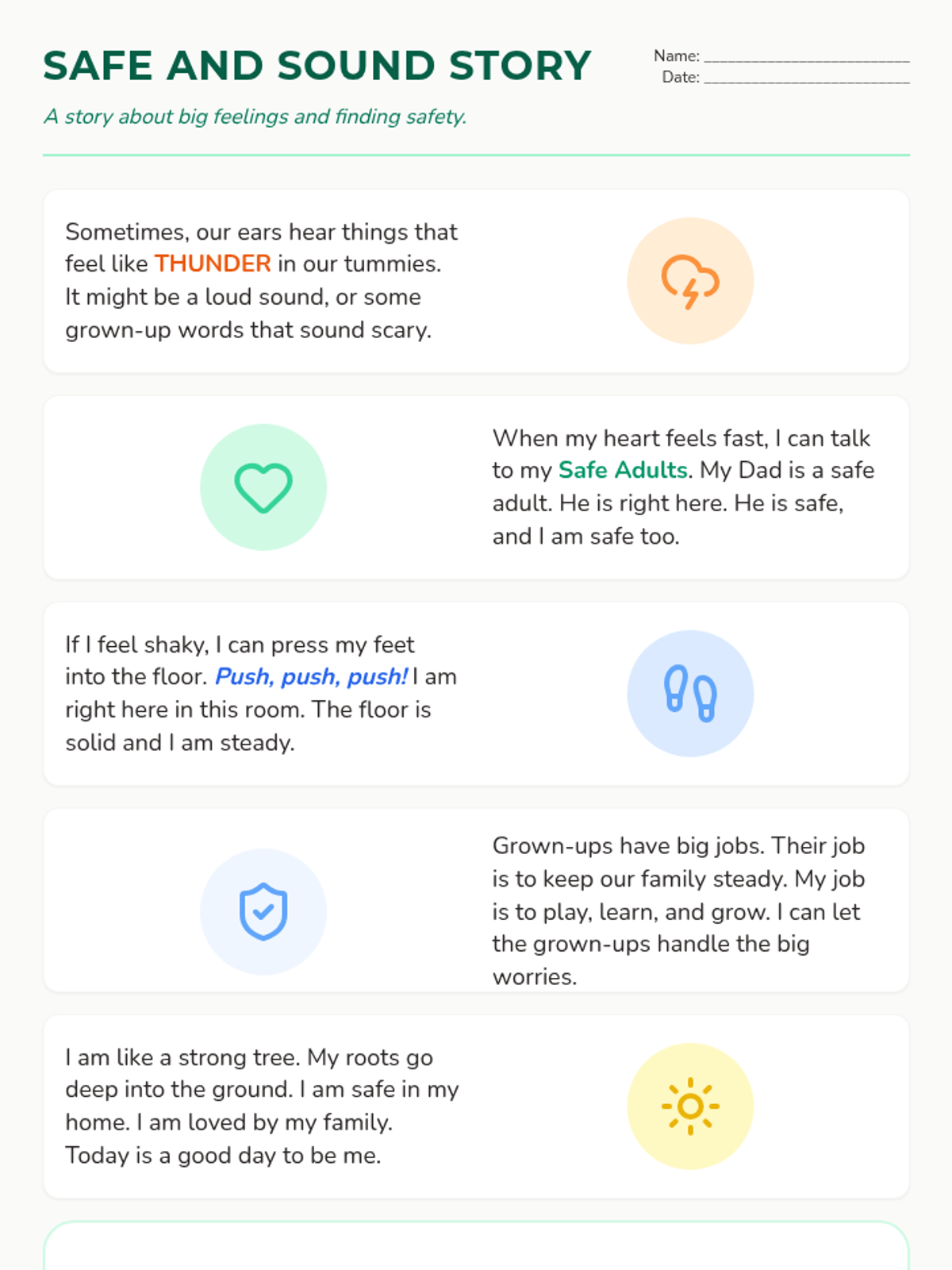 A social story and reflection worksheet for 1st grade students to help process anxiety, reinforce the concept of safe adults, and provide reassurance about family stability.