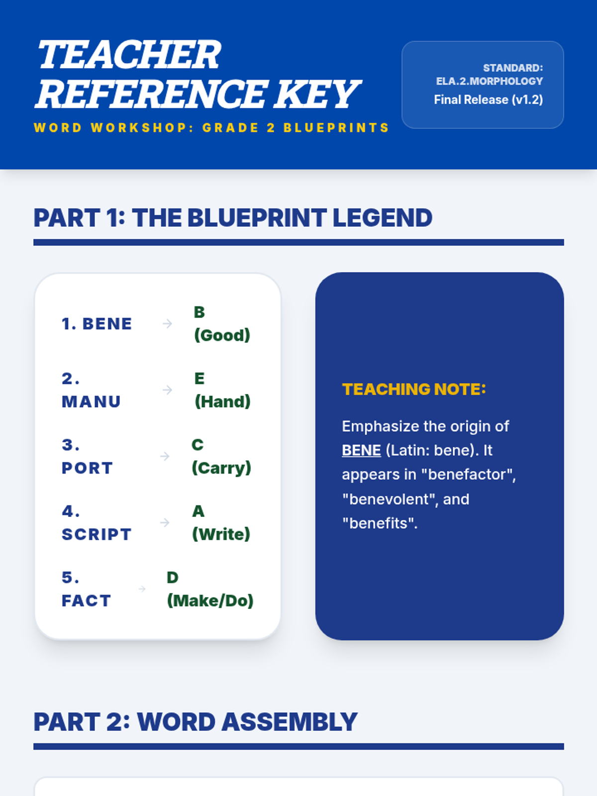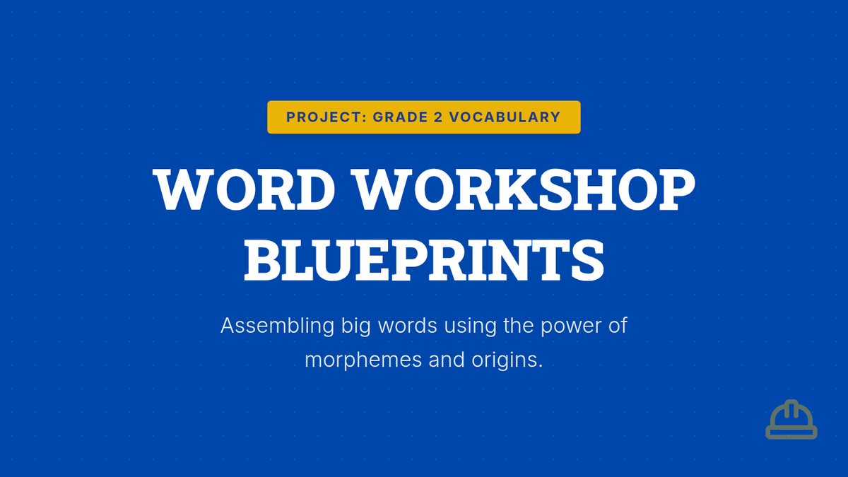 A blueprint-themed slide presentation for teaching Grade 2 students complex vocabulary and morphemes. The slides break down words like benefactor, manuscript, and import using their Latin origins (bene, manu, script, port, etc.) with high-contrast, visually engaging layouts.