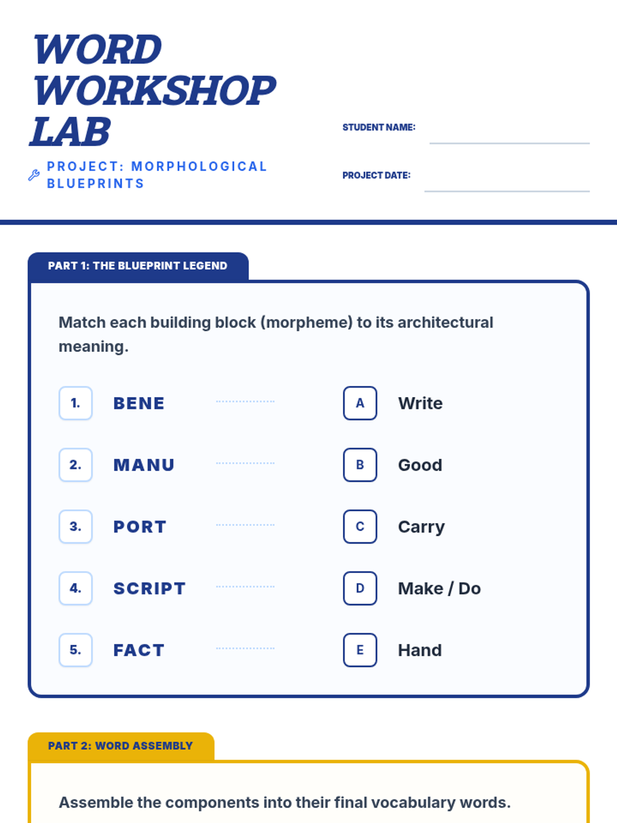 A student-facing worksheet for Grade 2 that reinforces morphological word building. It includes matching morphemes to meanings, assembling words from roots, spelling pattern practice (ai/ay), and sentence completion for advanced vocabulary.