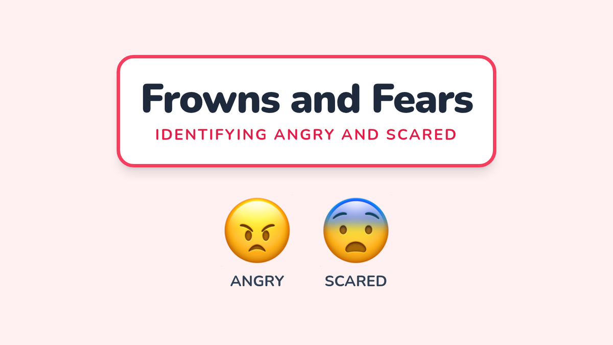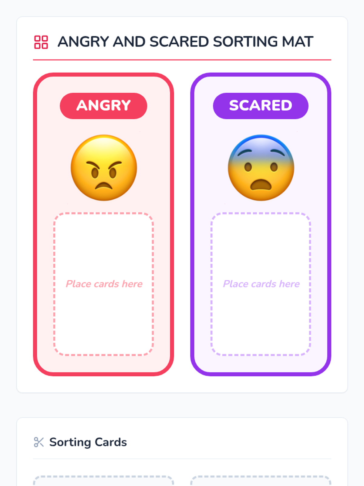 A printable sorting mat and set of photo match cards for the 'Angry' and 'Scared' lesson. Features color-coded landing zones and detailed photo descriptions for visual discrimination practice.