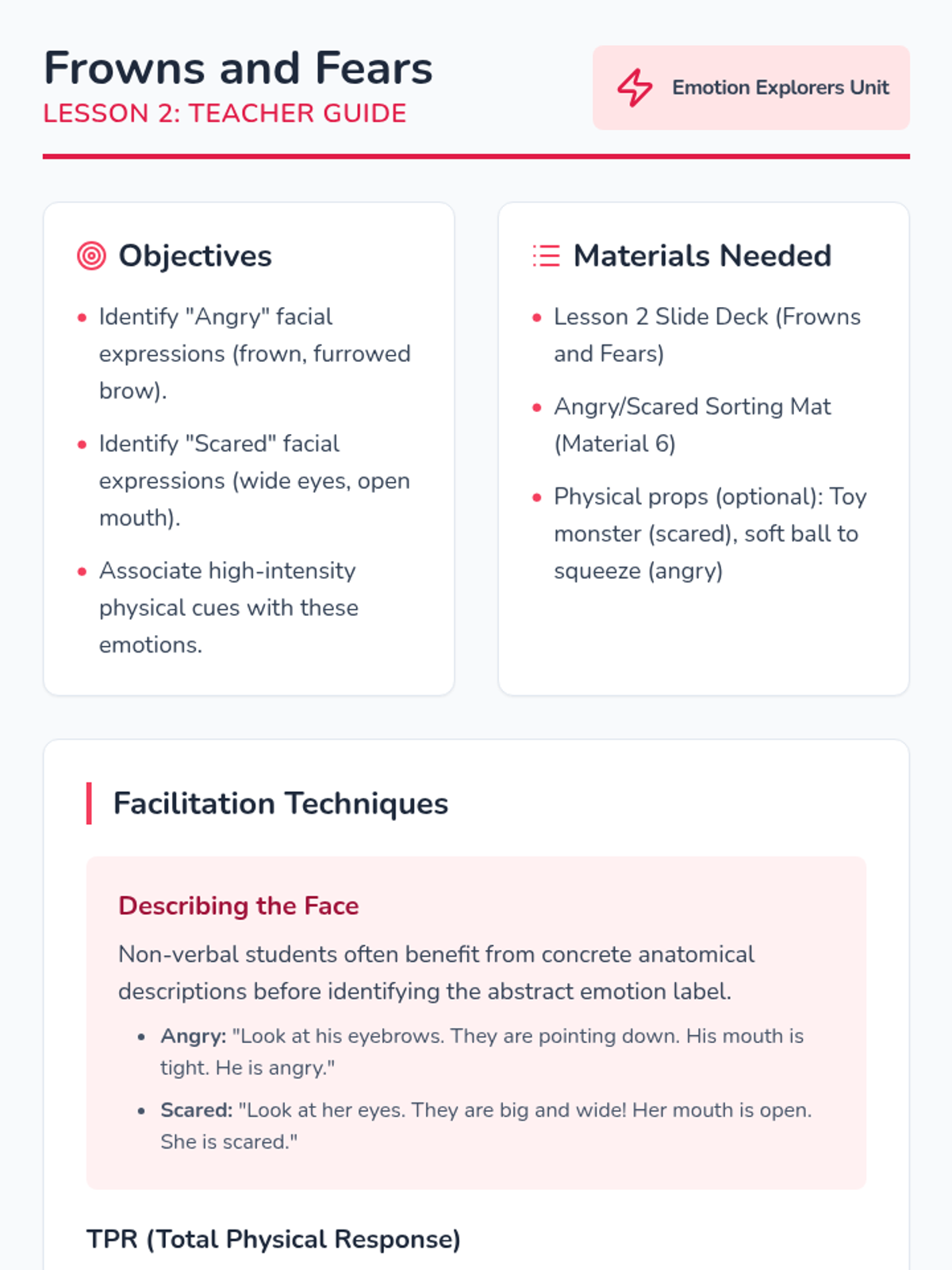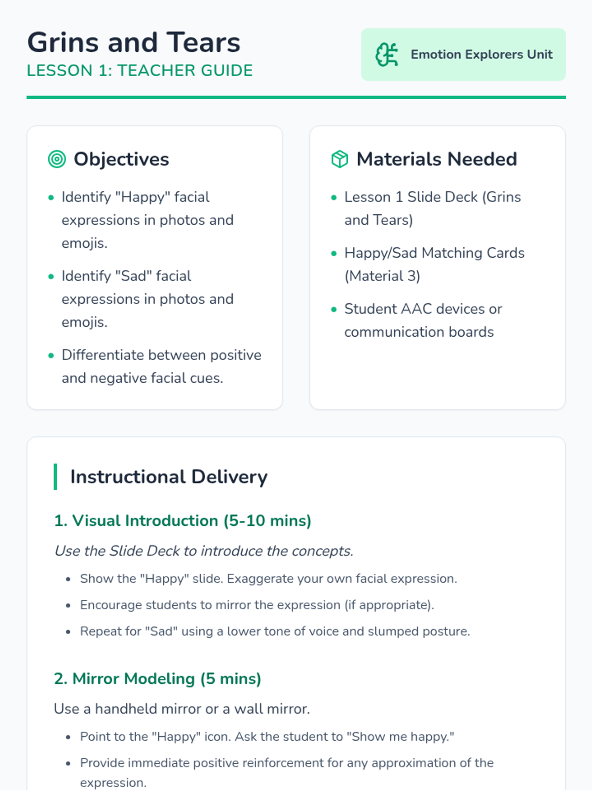A comprehensive teacher guide for Lesson 1, providing instructional strategies, prompting hierarchies, and AAC integration tips specifically for non-verbal students learning happy and sad emotions.