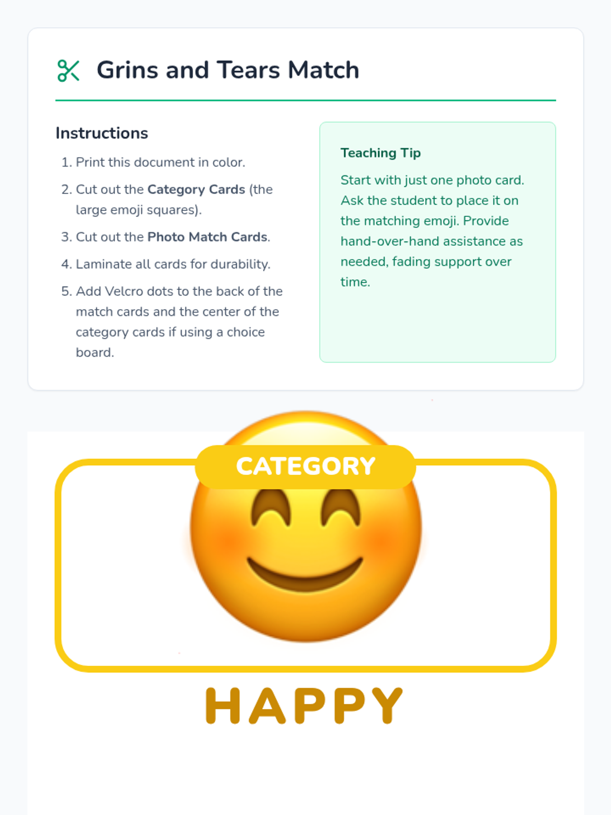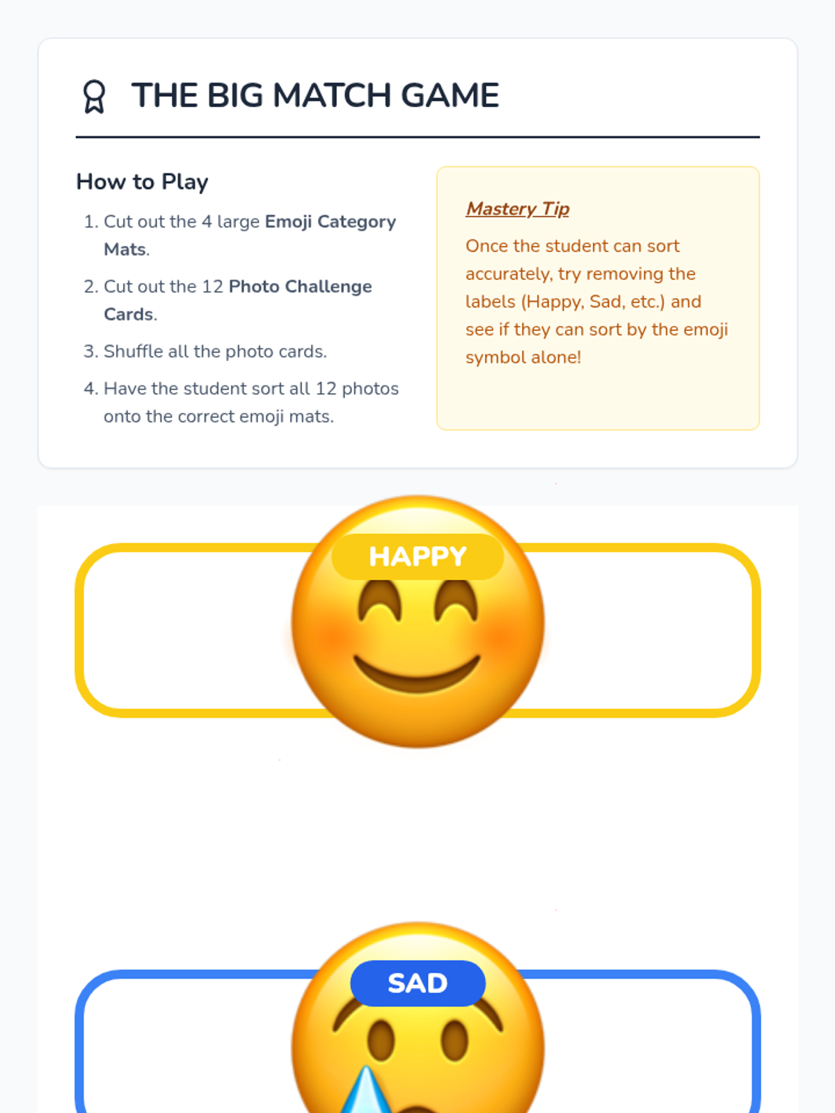 The final mastery matching game for Lesson 3. Includes 4 large emoji category mats and 12 photo challenge card frames with detailed descriptions for generalization practice across all core emotions.
