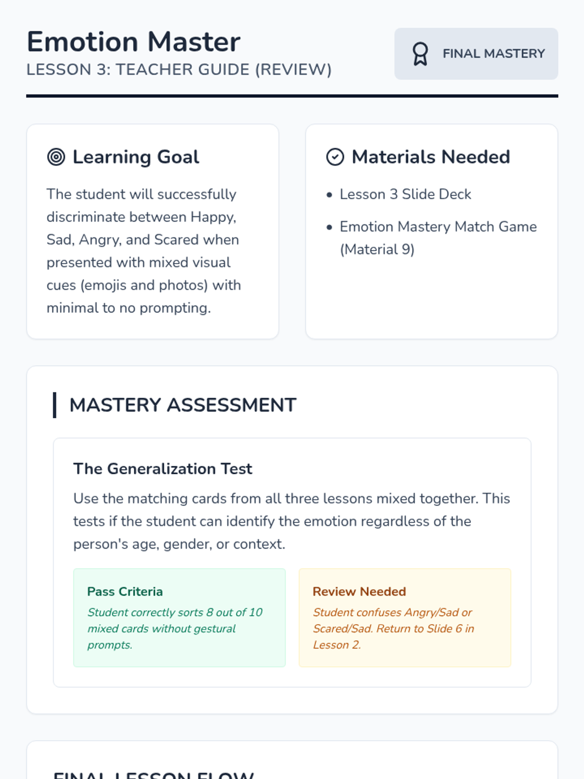 A teacher-facing lesson plan for the final review lesson, focusing on generalization, mastery assessment, and mixed-emotion discrimination for non-verbal students.