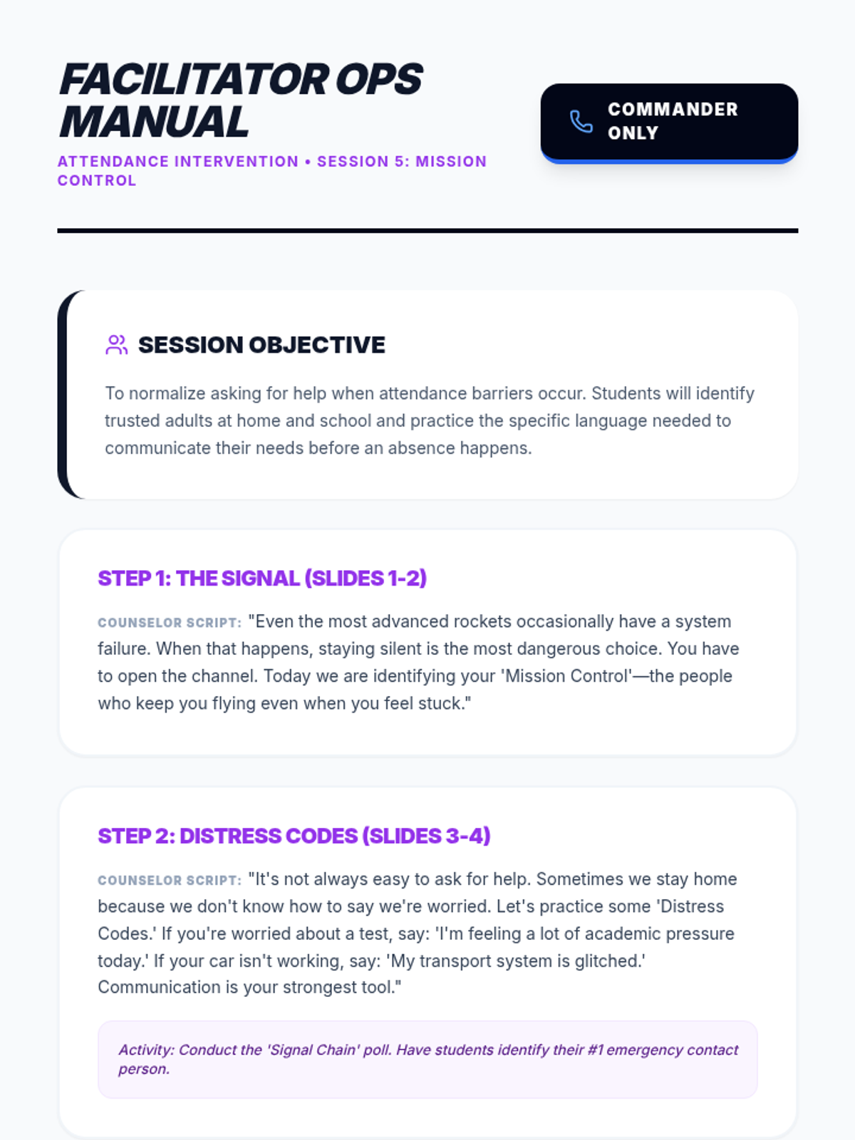 A detailed facilitation guide for the fifth session of the Launchpad League attendance group. Focuses on support systems and self-advocacy language. Includes scripts for normalizing help-seeking behavior.