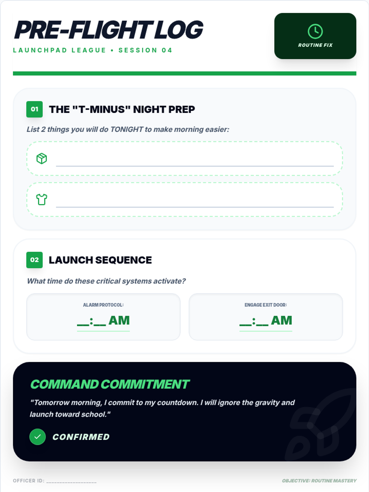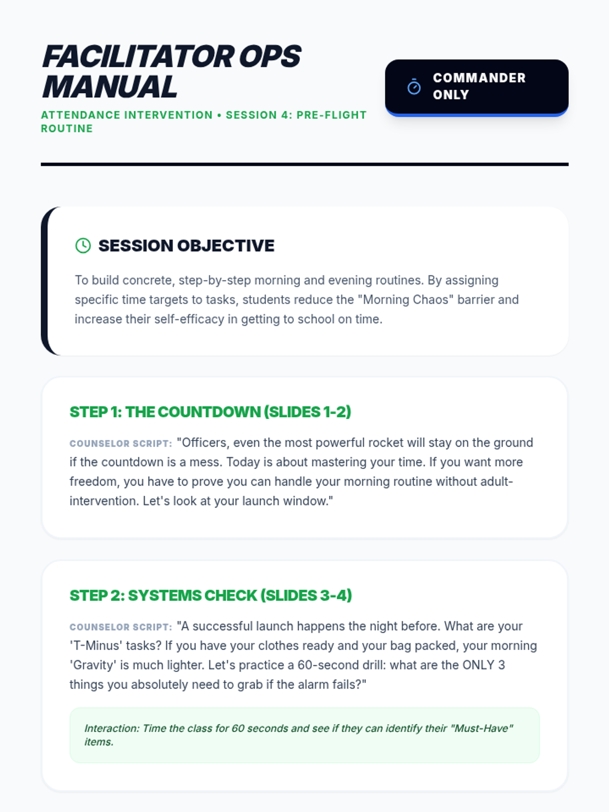 A detailed facilitation guide for the fourth session of the Launchpad League attendance group. Focuses on the logistical 'how-to' of getting to school, emphasizing prep and time management. Includes routine-building scripts.