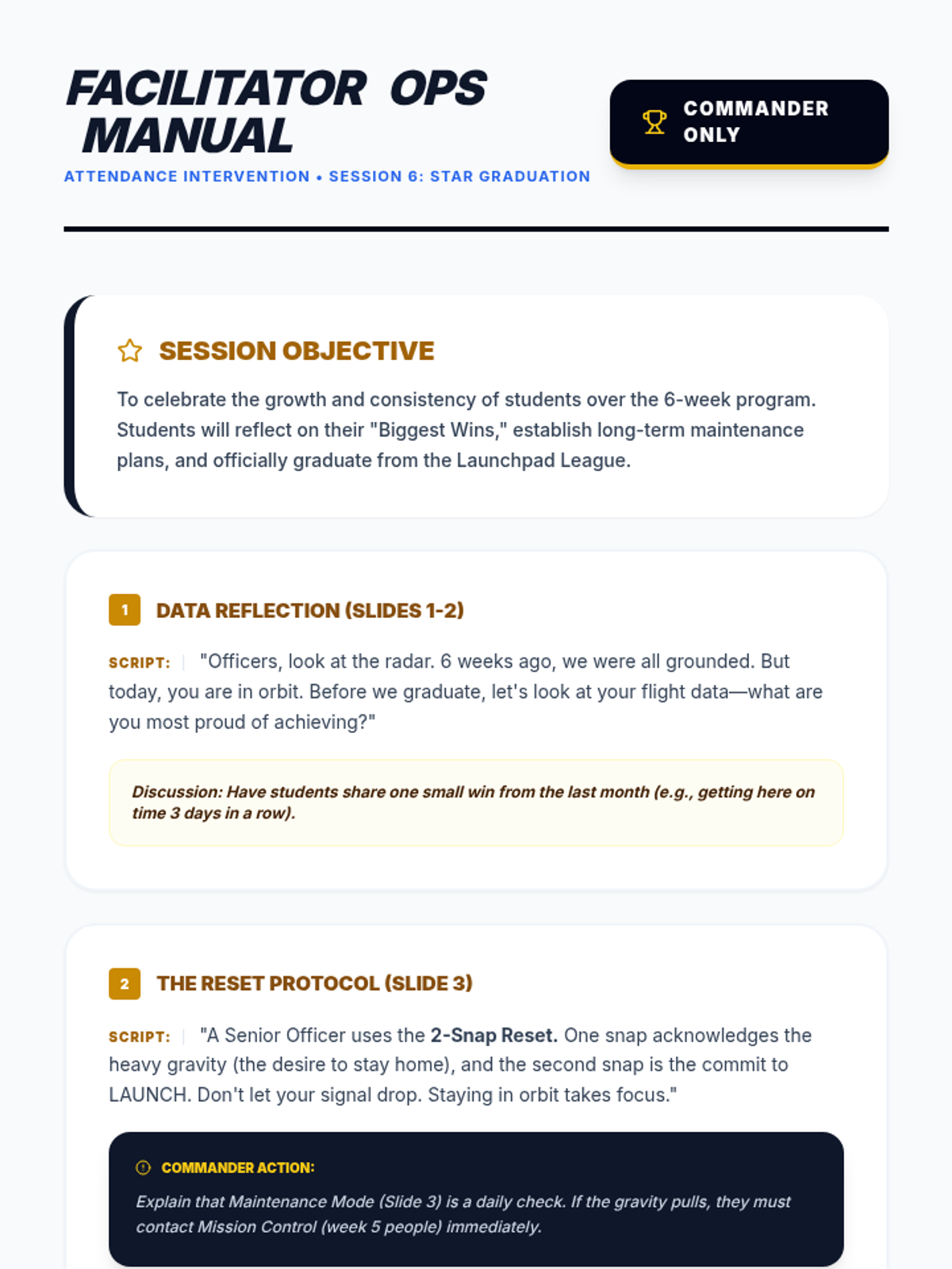 The final celebration and transition session for the 'Launchpad League' attendance group. Updated with maintenance talking points, the 2-snap reset example, and improved header spacing.