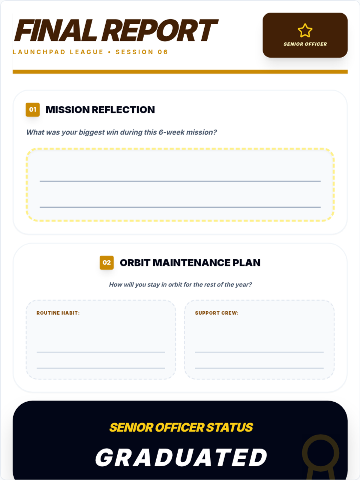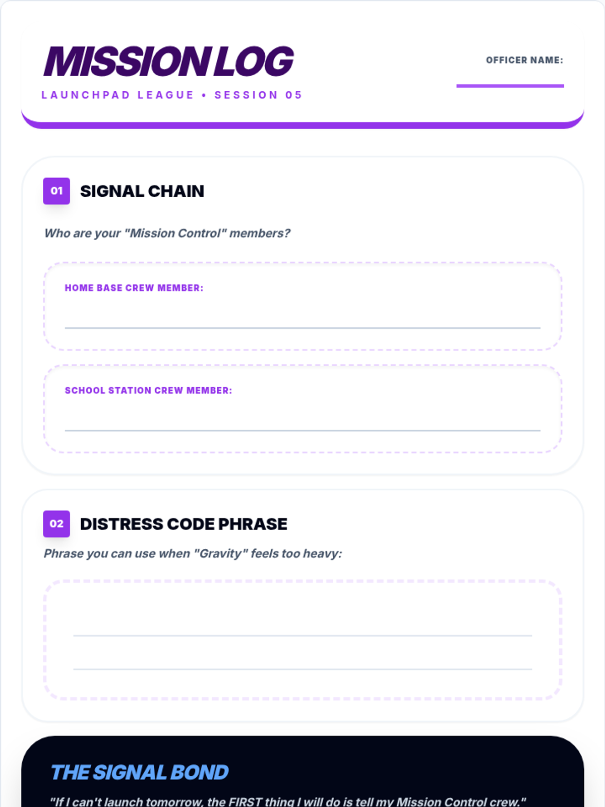 The final student-facing reflection worksheet for the Launchpad League attendance group. Updated with more writing lines, improved reflection prompts, and a single-page layout. Updated for contrast and spacing.