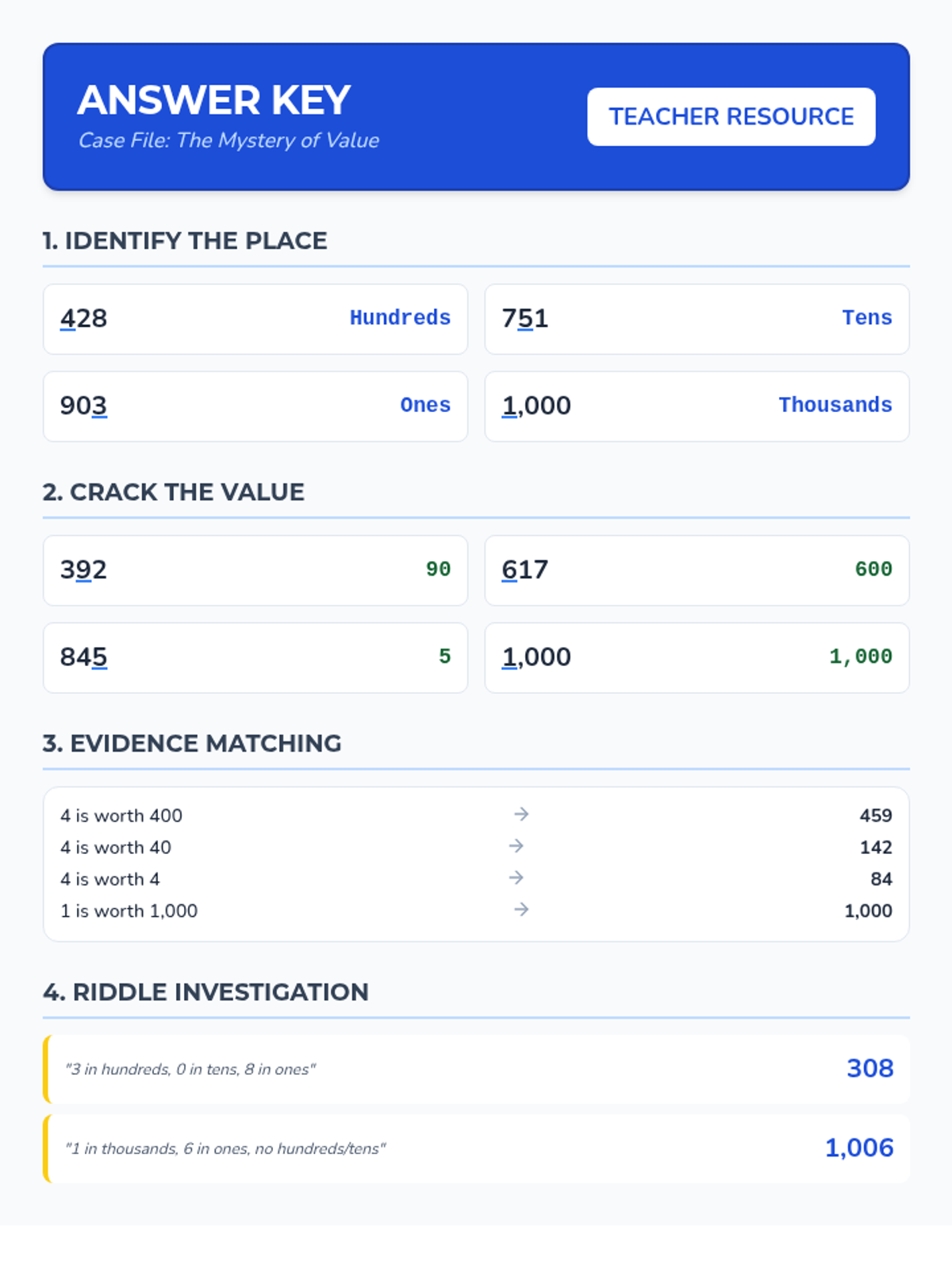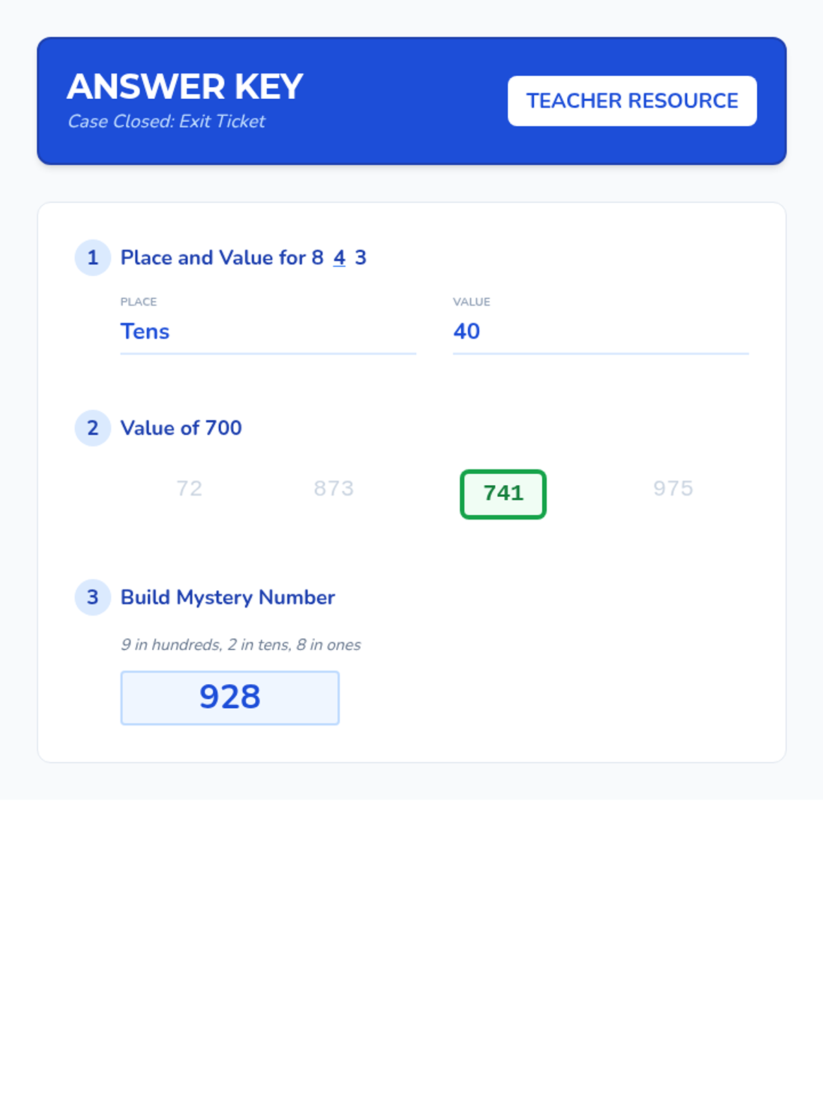 Teacher answer key for the Digit Detectives Exit Ticket, updated to stay within the 1,000 limit and featuring consistent, high-contrast styling.