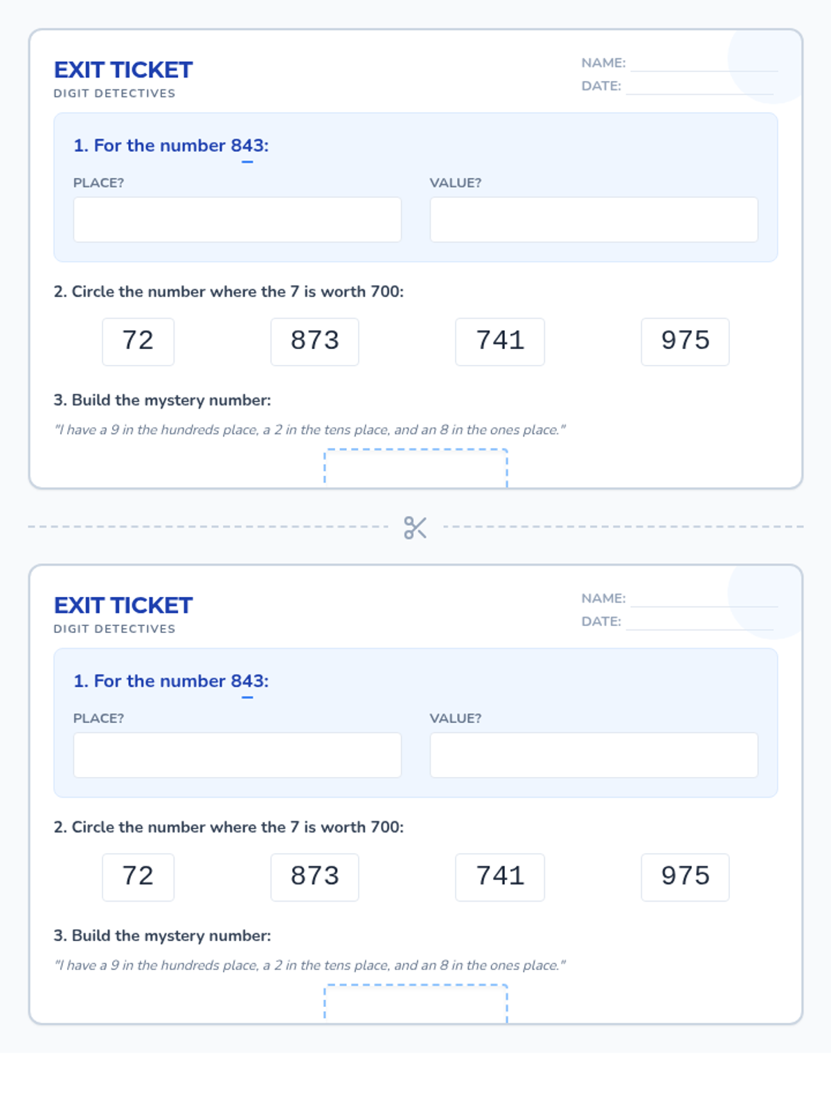 A 2-up exit ticket for 3rd grade place value assessment. Revised to stay within the 1,000 limit, fit properly on a single page with reduced heights, and include larger fonts for student fields.