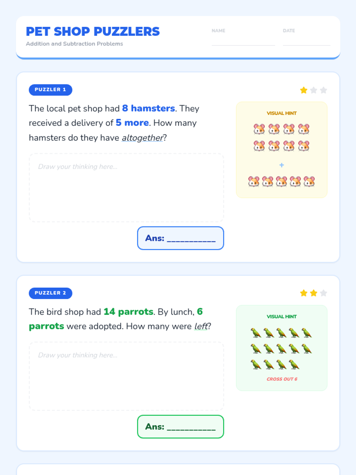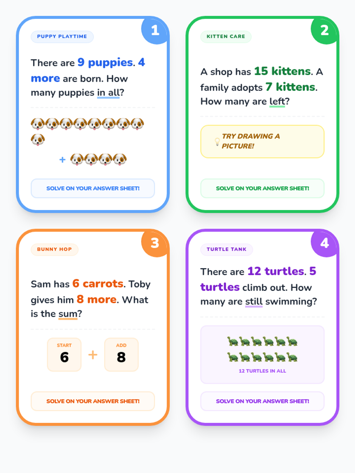 A set of visually engaging task cards featuring addition and subtraction word problems with hints and scaffolds for independent or small group work.