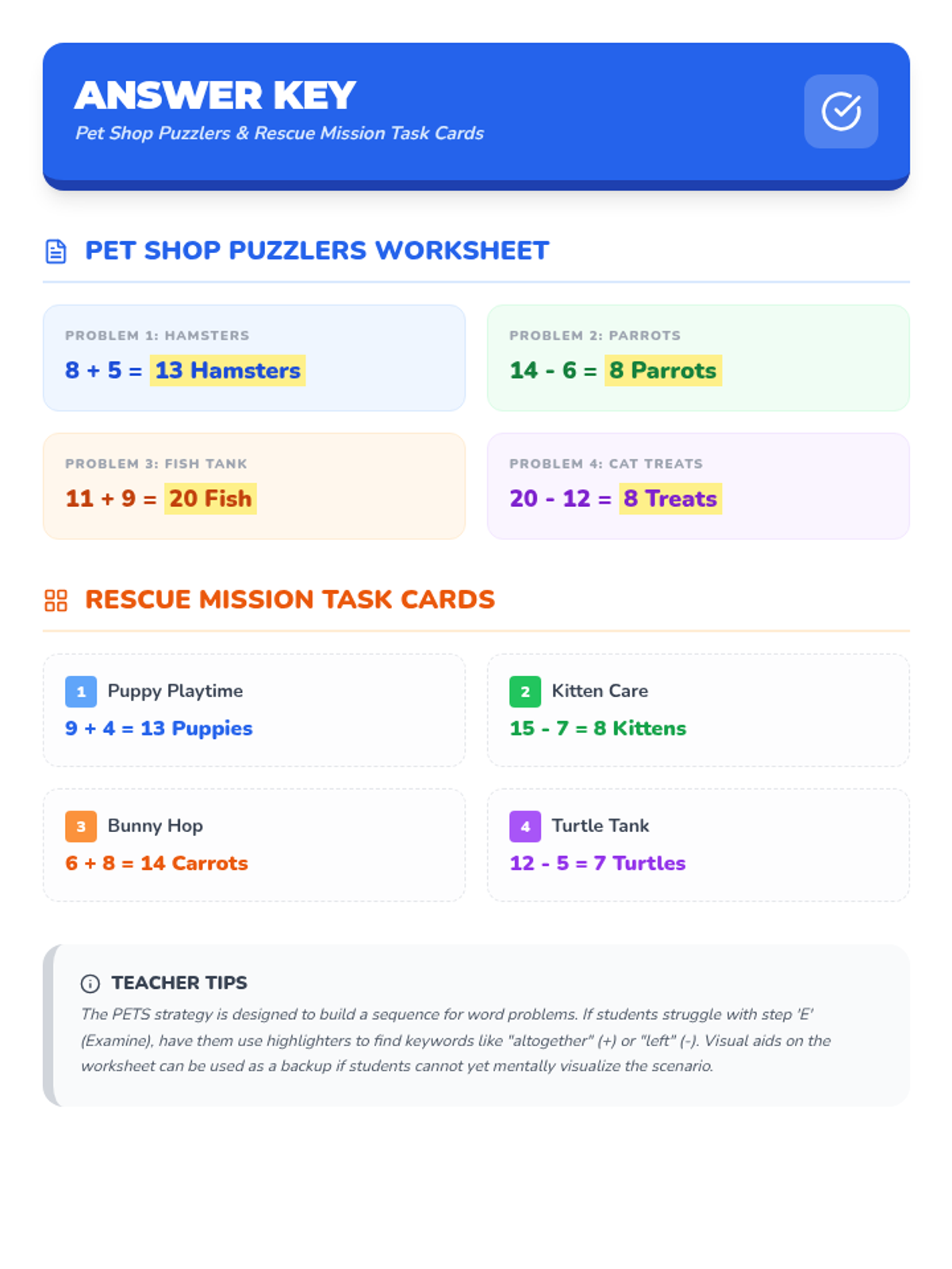 A comprehensive answer key for both the Pet Shop Puzzlers worksheet and the Rescue Mission task cards, including equations and final labeled answers.